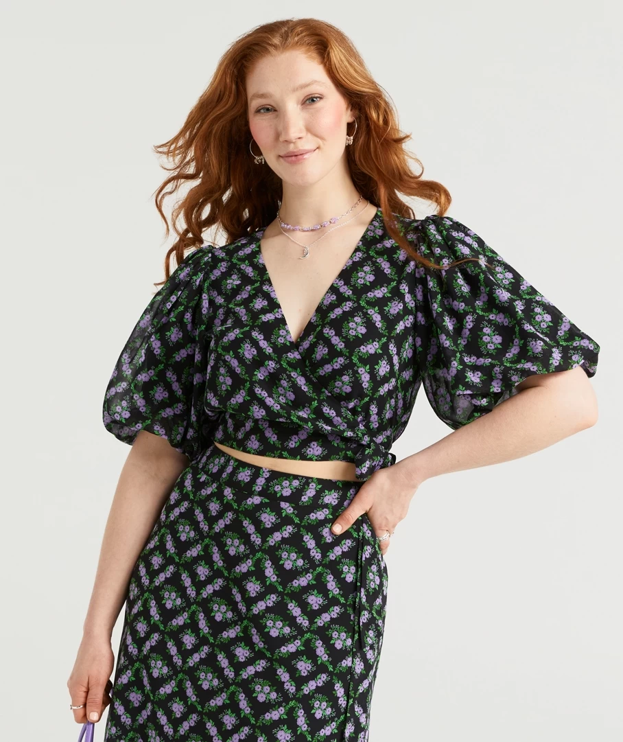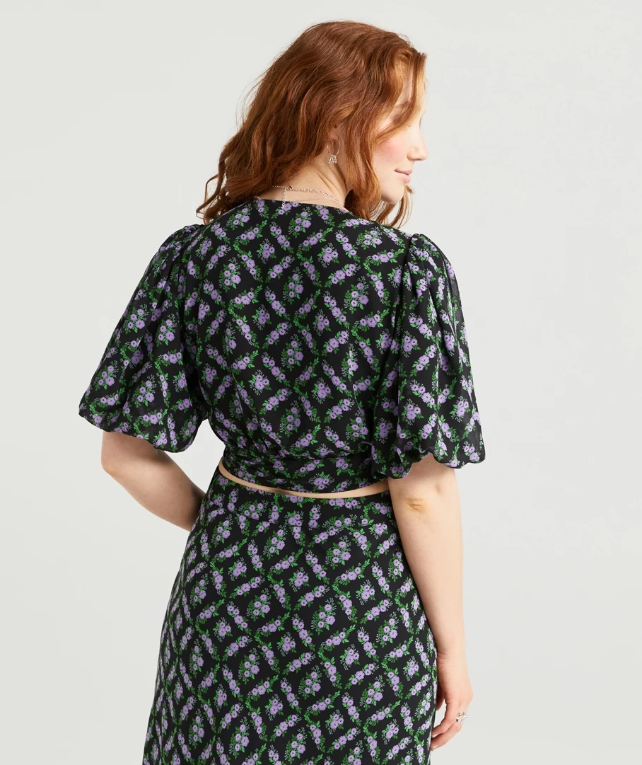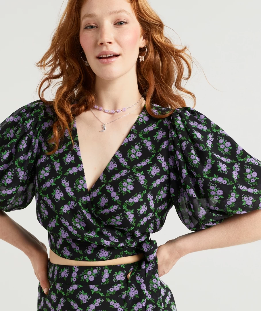 All in the print with the Aliyah Volume Sleeve Wrap Top. Featuring a tie wrap around style, made with a lightweight fabric and short puff sleeves. Perfect for styling with the matching skirt for a complete look.