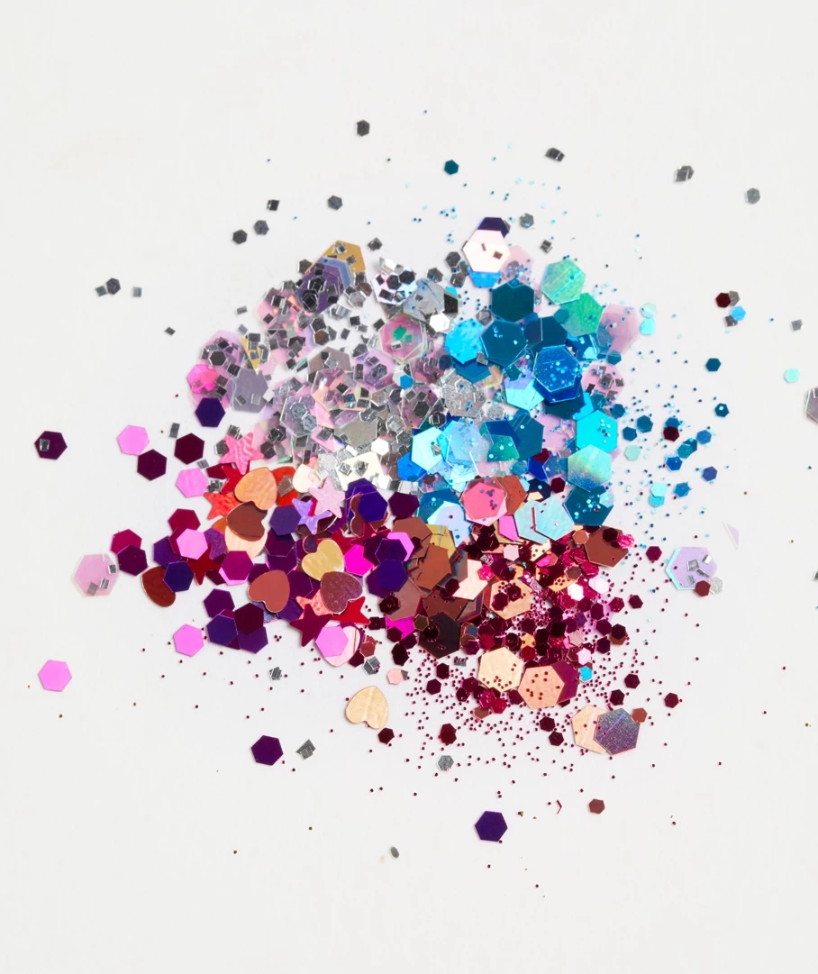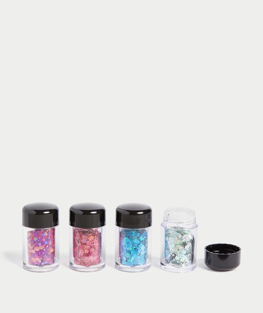 Sparkle and shine with this four pack of loose glitters. Perfect for parties and festivals! Can be used as: – Face – Glitter drenched lips, dazzling cheekbones. – Body – Sparkling collarbones – Nails – Top tips – Hair – Shimmering roots. TOP TIP: Apply clear beauty glue as a base to adhere the glitter to the skin.