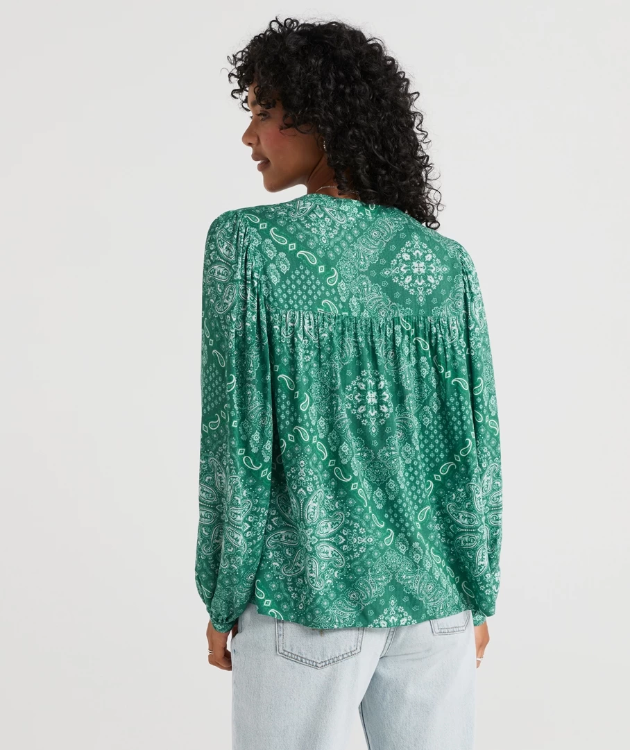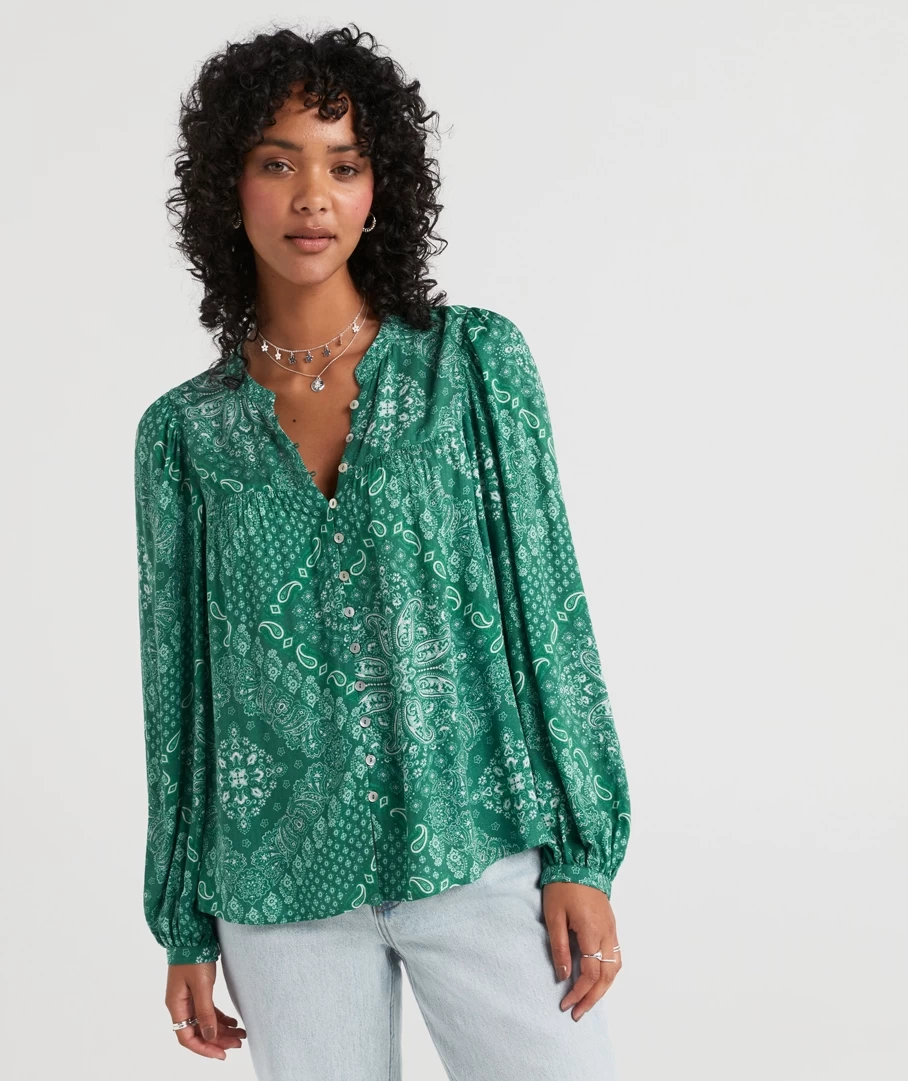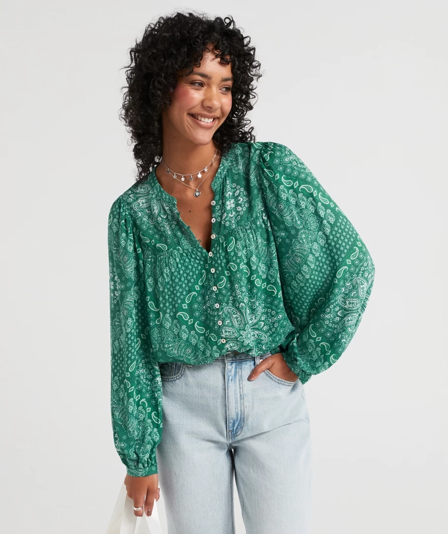 For a boho moment the Andie Button Through Yoke Blouse is the perfect pick. Made with a lightweight fabric, long sleeves, loose fit, buttons down the front and pretty paisley print all over. Pair with denim and add some boots to complete your look.