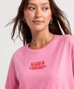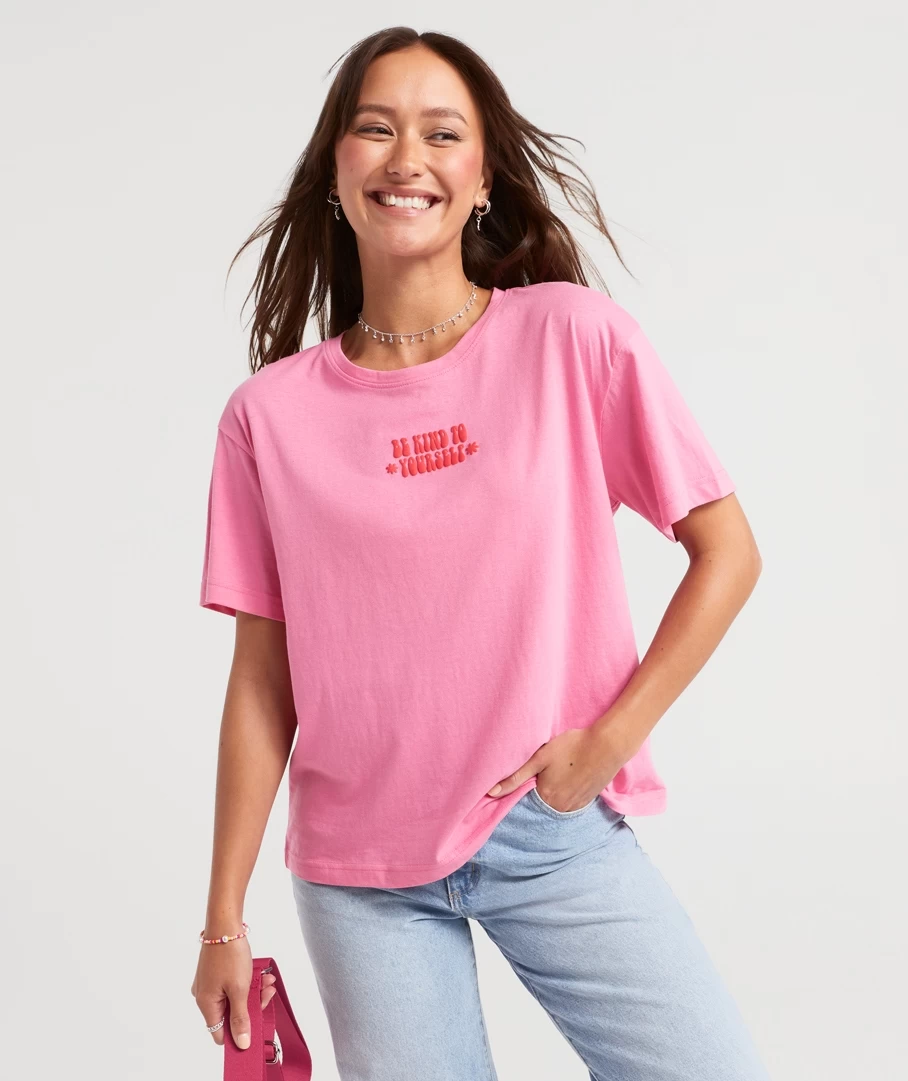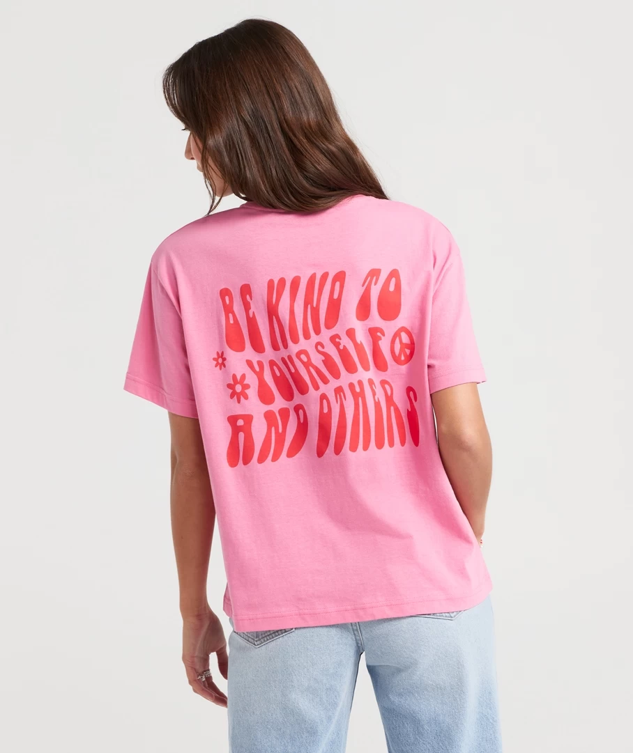 Take a moment to look inward with the Be Kind Oversized Graphic T-Shirt. A full length, pink tee, with short sleeves, an oversized fit and graphic on the front and back in red bubble font.