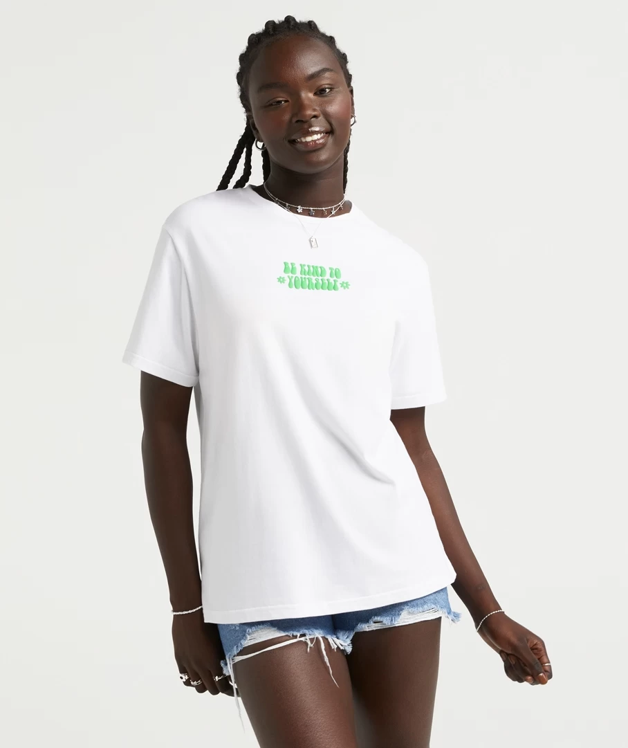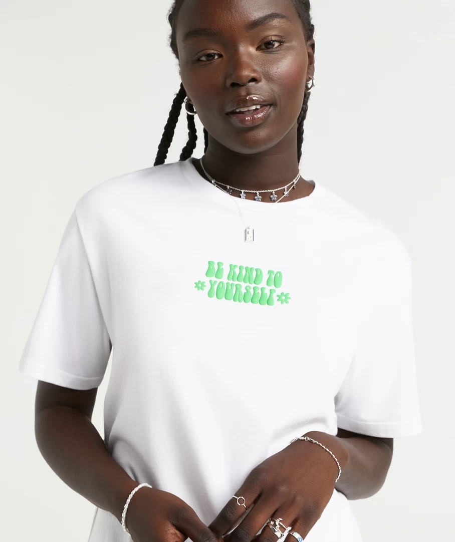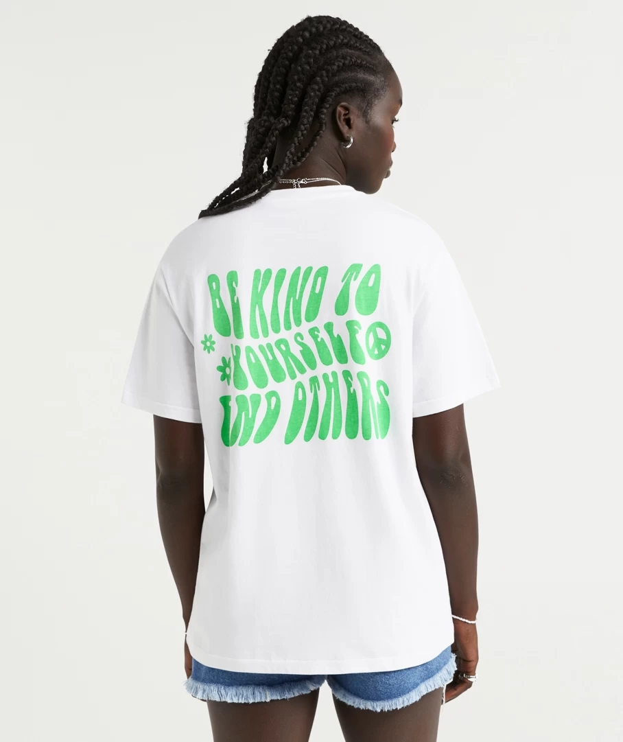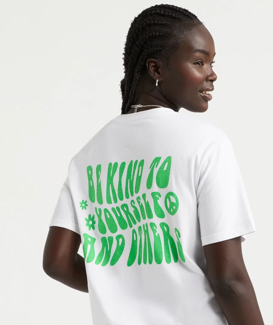 Take a moment to look inward with the Be Kind Oversized Graphic T-Shirt. With 100% cotton, full length, short sleeves, oversized fit and graphic on the front and back in green bubble font. Add some jewellery to elevate your look.