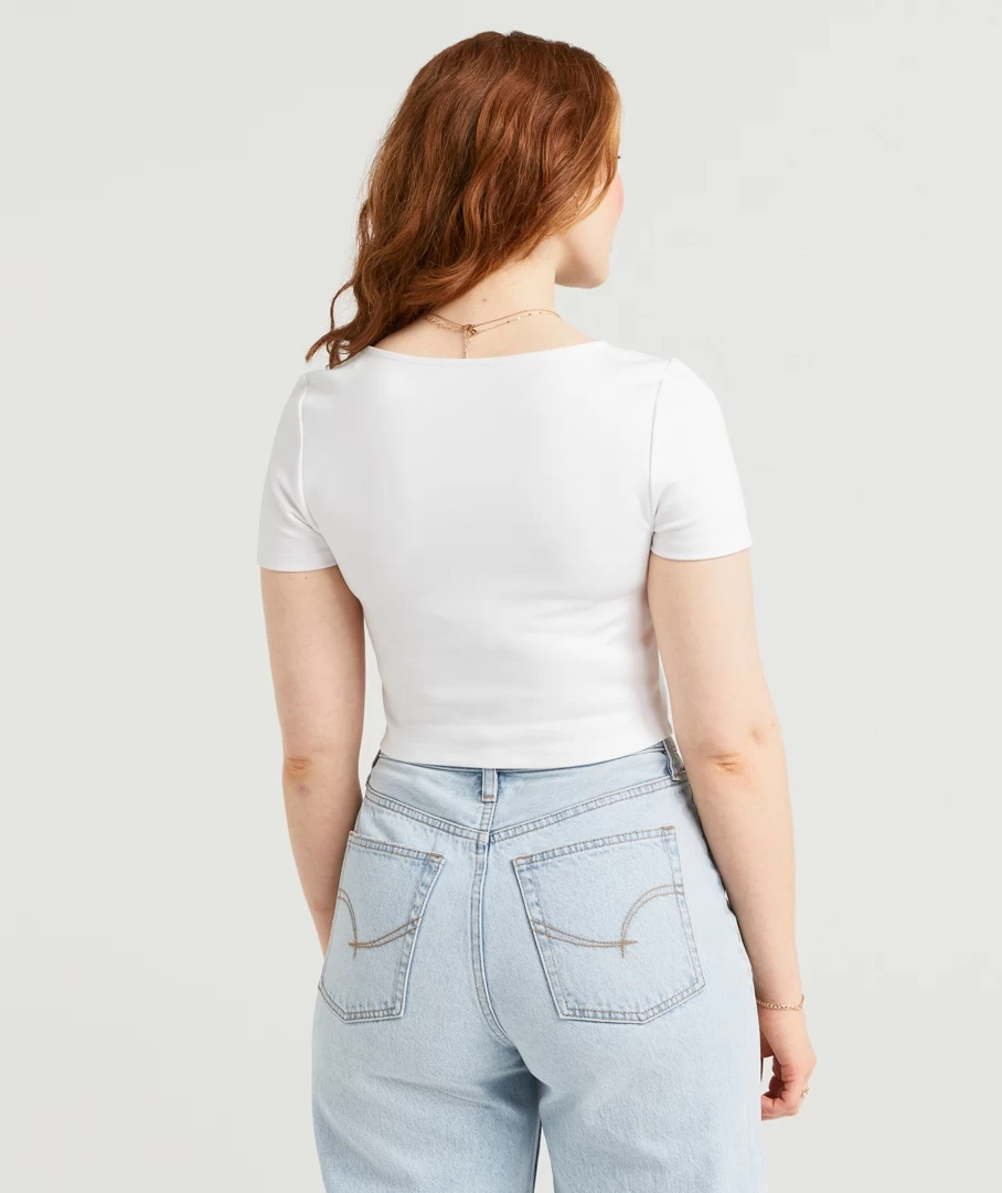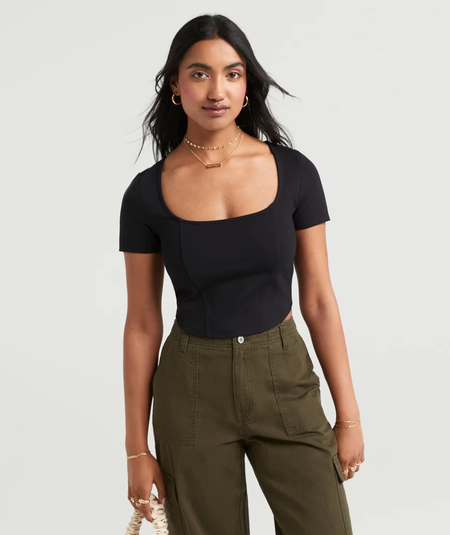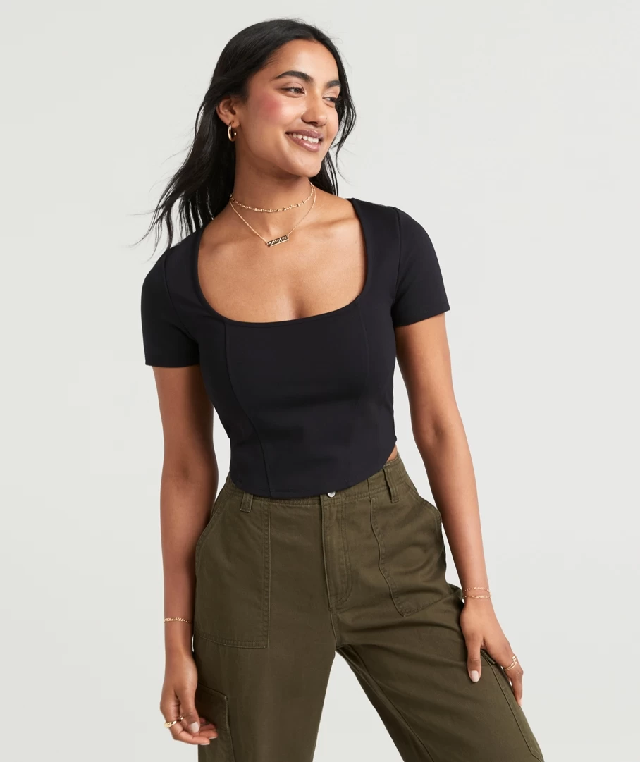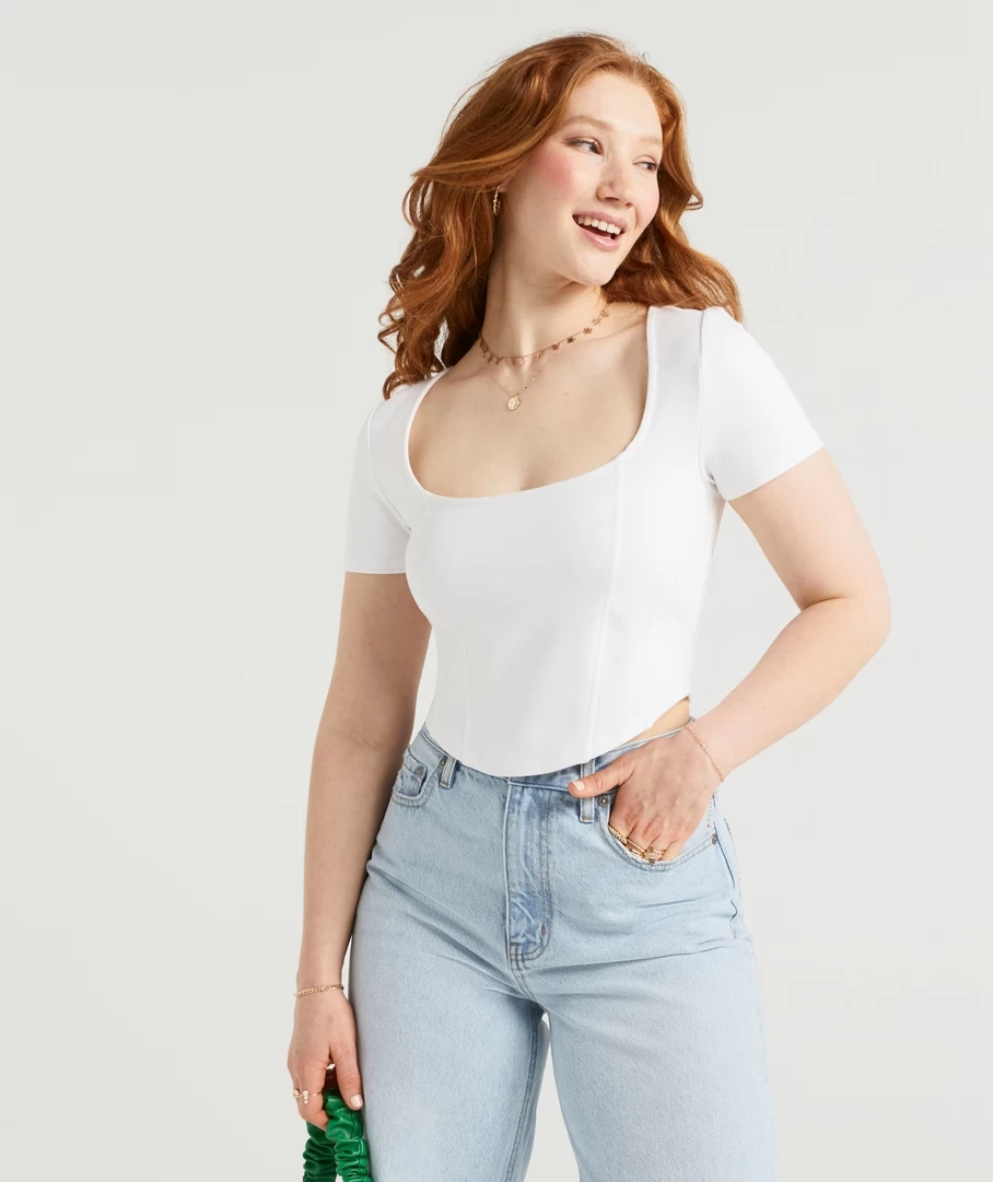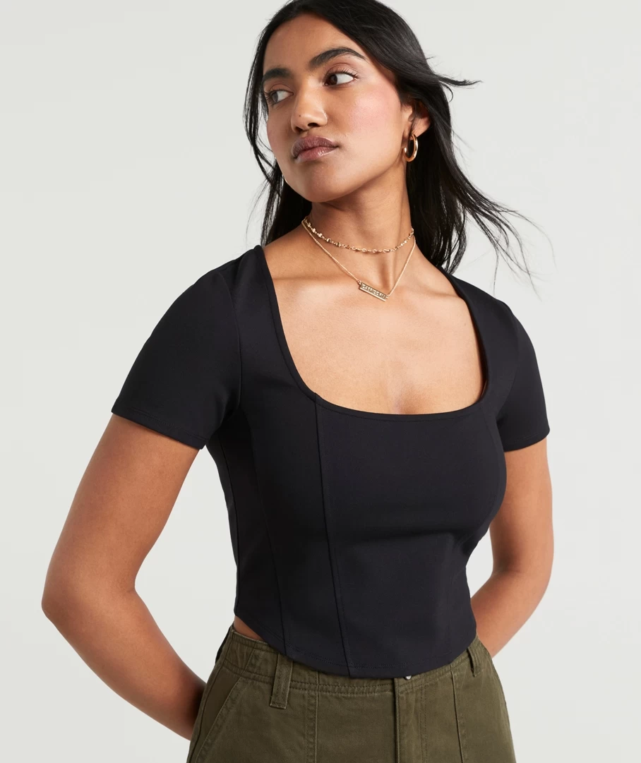 Your new fave go to top, the Bella Ponte Short sleeve Top. The corset style is perfect for your ”jeans and a top” look but can also be dressed up with heels! Made from a lightweight fabric with a cropped length, making the perfect top for any ”fit.