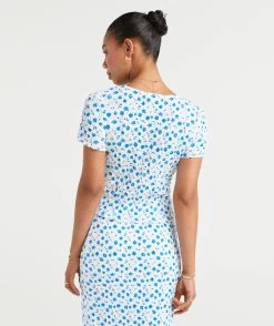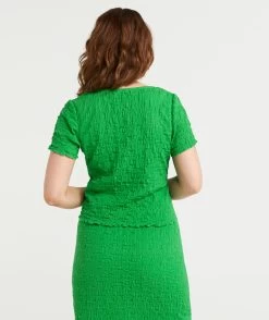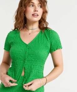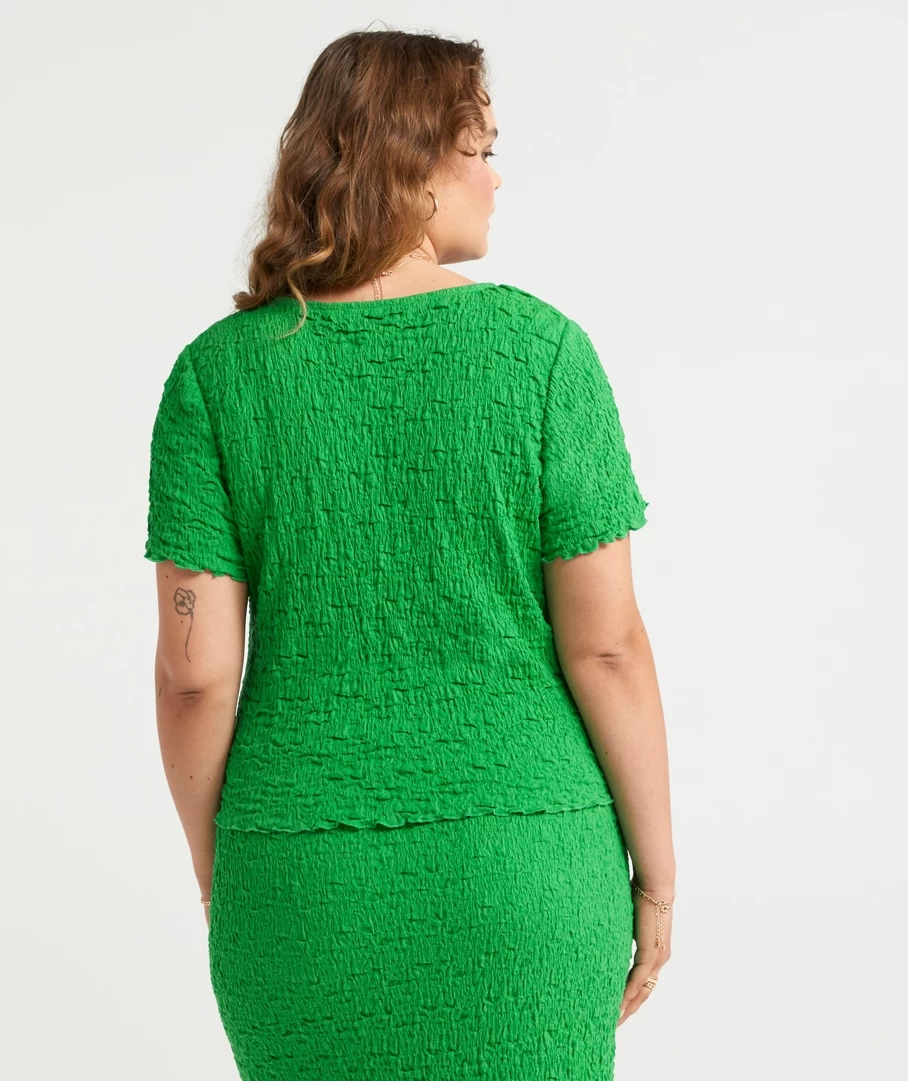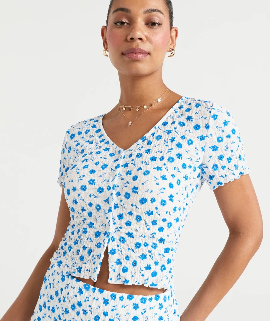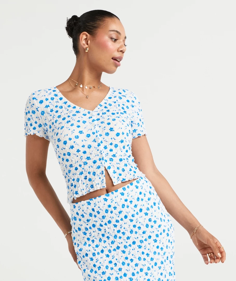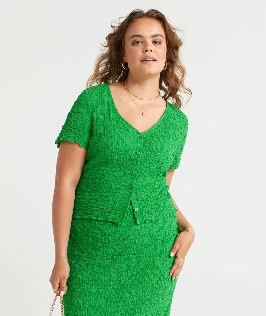 Elevate a casual look with the Bianca Textured Button Through Top. Made with a cotton blend, short sleeves, frill hemline, textured fabric and buttons down the front. Pair with its matching midi skirt for a cute set. Add some new slides and you are set.