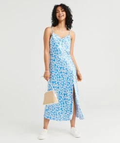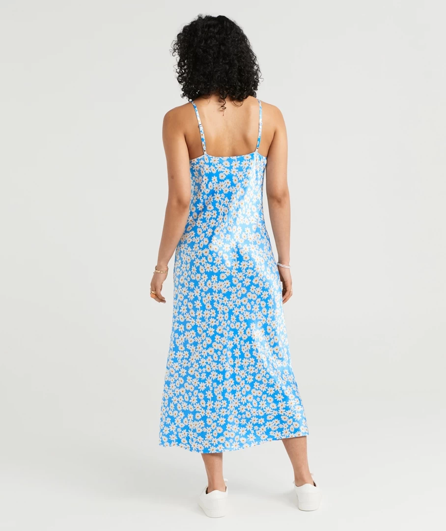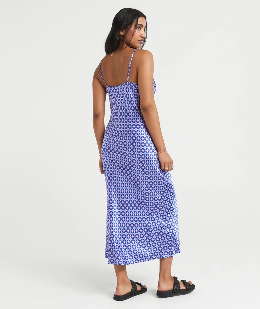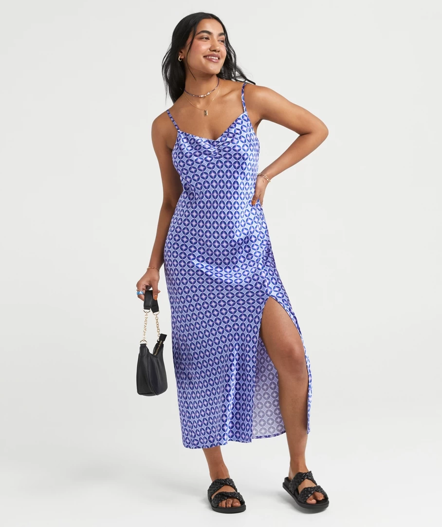 Slip into something that is sure to impress with the Callie Satin Slip Midi Dress. Made with a satin feel all over, slim fit throughout the body, midi length, a front split, thin adjustable straps and a purple geo print all over. Pair with a pretty bag to complete your look.