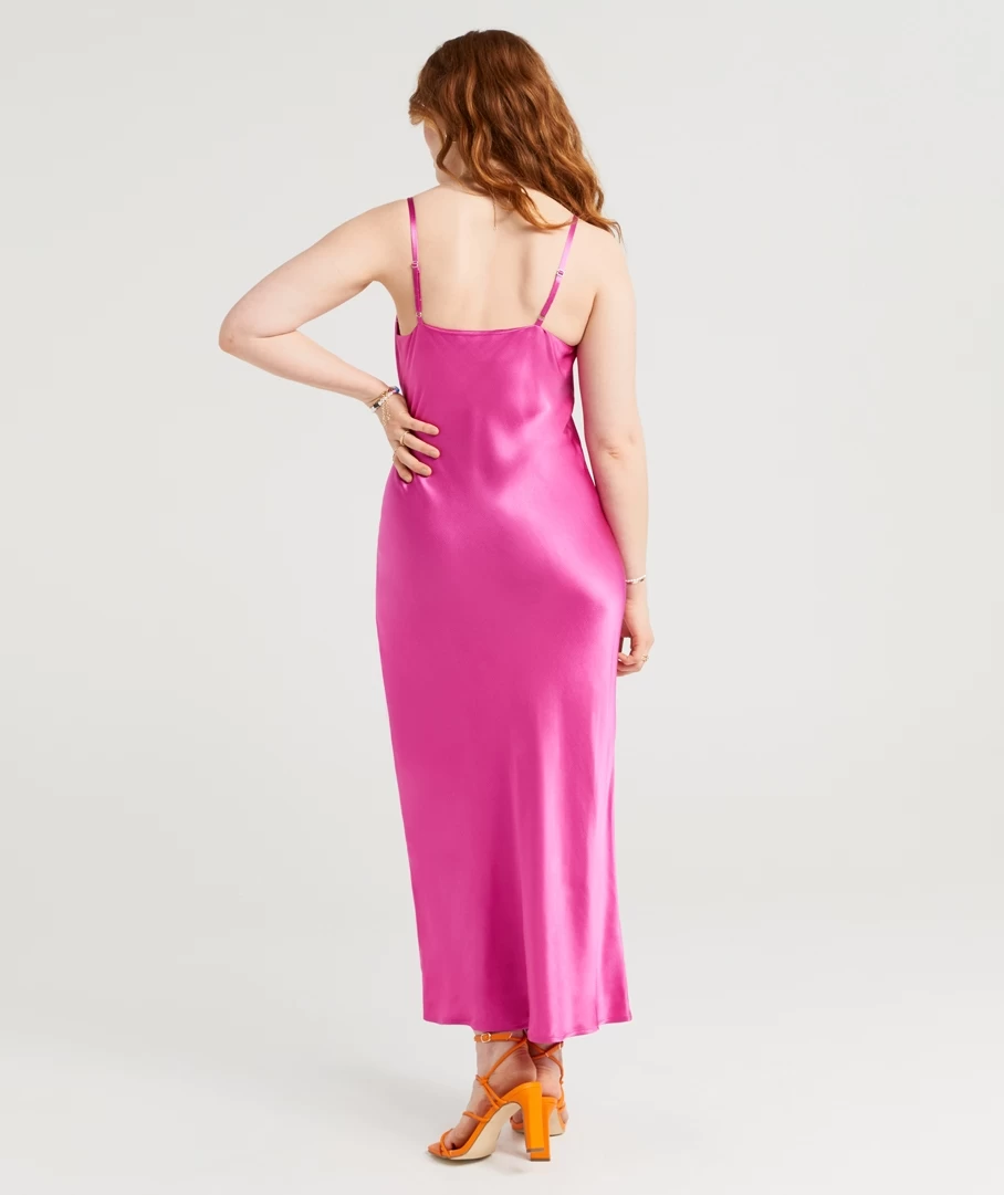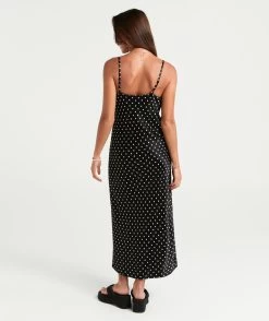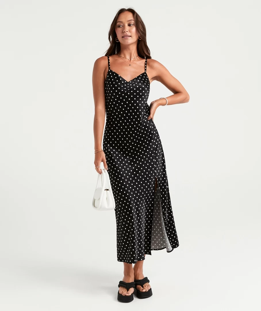 Slip into something that is sure to impress with the Callie Satin Slip Midi Dress. Made with a satin feel all over, slim fit throughout the body, midi length, a front split, thin adjustable straps and classic black colour. Add some new mules and you are set.