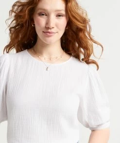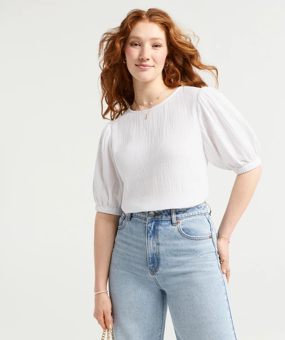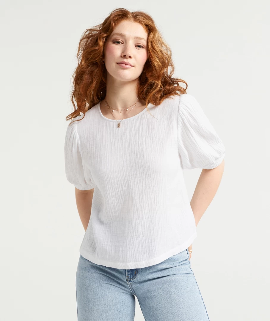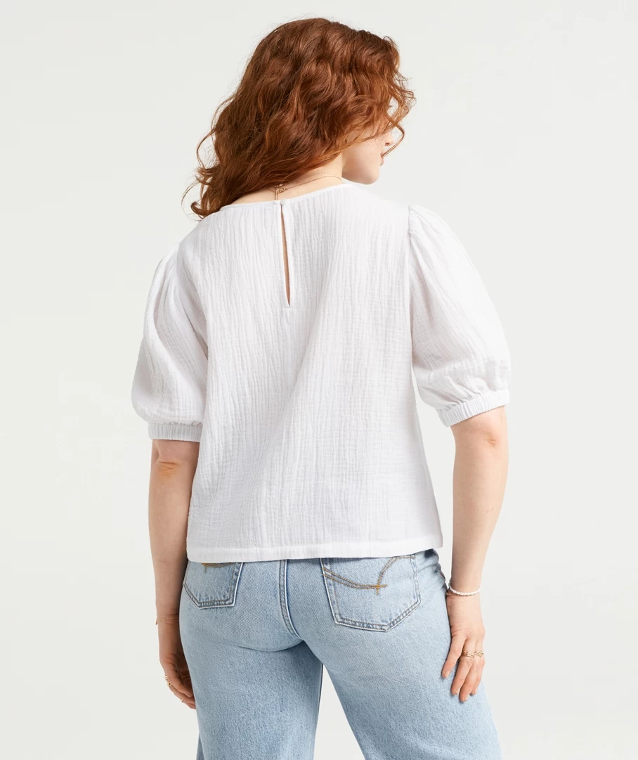 Add to the essentials with the Cassidy Cotton Muslin Top. Made with 100% cotton, short puff sleeves, full length, round high neckline, soft muslin feel and white colour. Pair with your fave jeans for a casual fit.