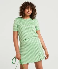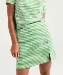 Be cute in gingham with the Check Mini Skirt. Made with a lightweight fabric, mini length, high waisted, thigh split, elastic waist band and green gingham print all over. Pair with its matching Eadie Gingham Short Sleeve Top for a cute set. Add your fave bag to complete your look.