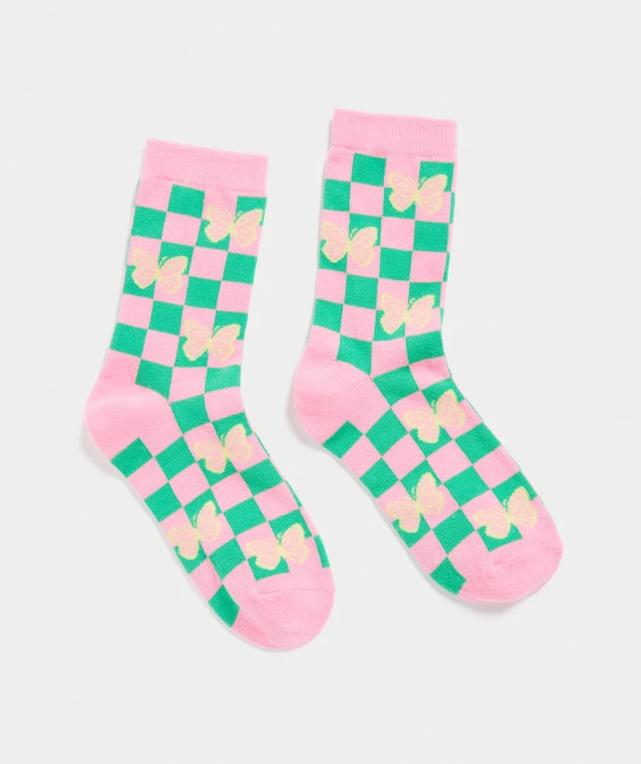 Treat your feet with the Checked Butterfly Crew Sock. These novelty crew socks will add some fun to your look. They feature pink and green check print with butterflies all over.