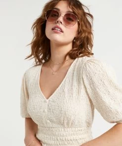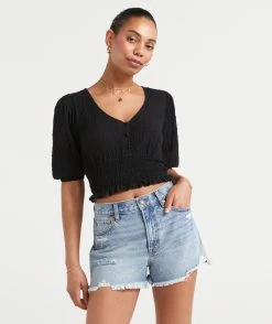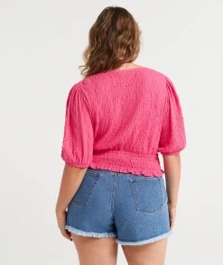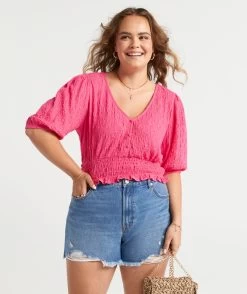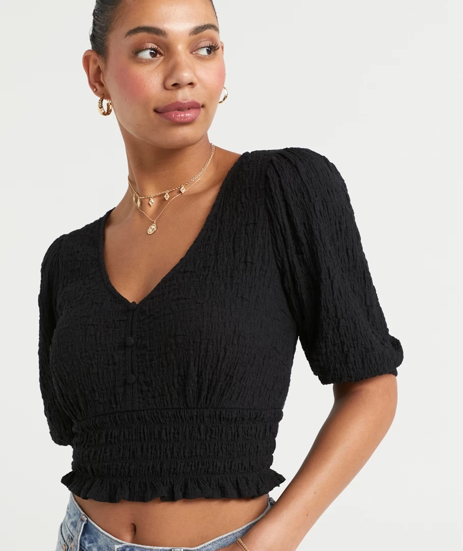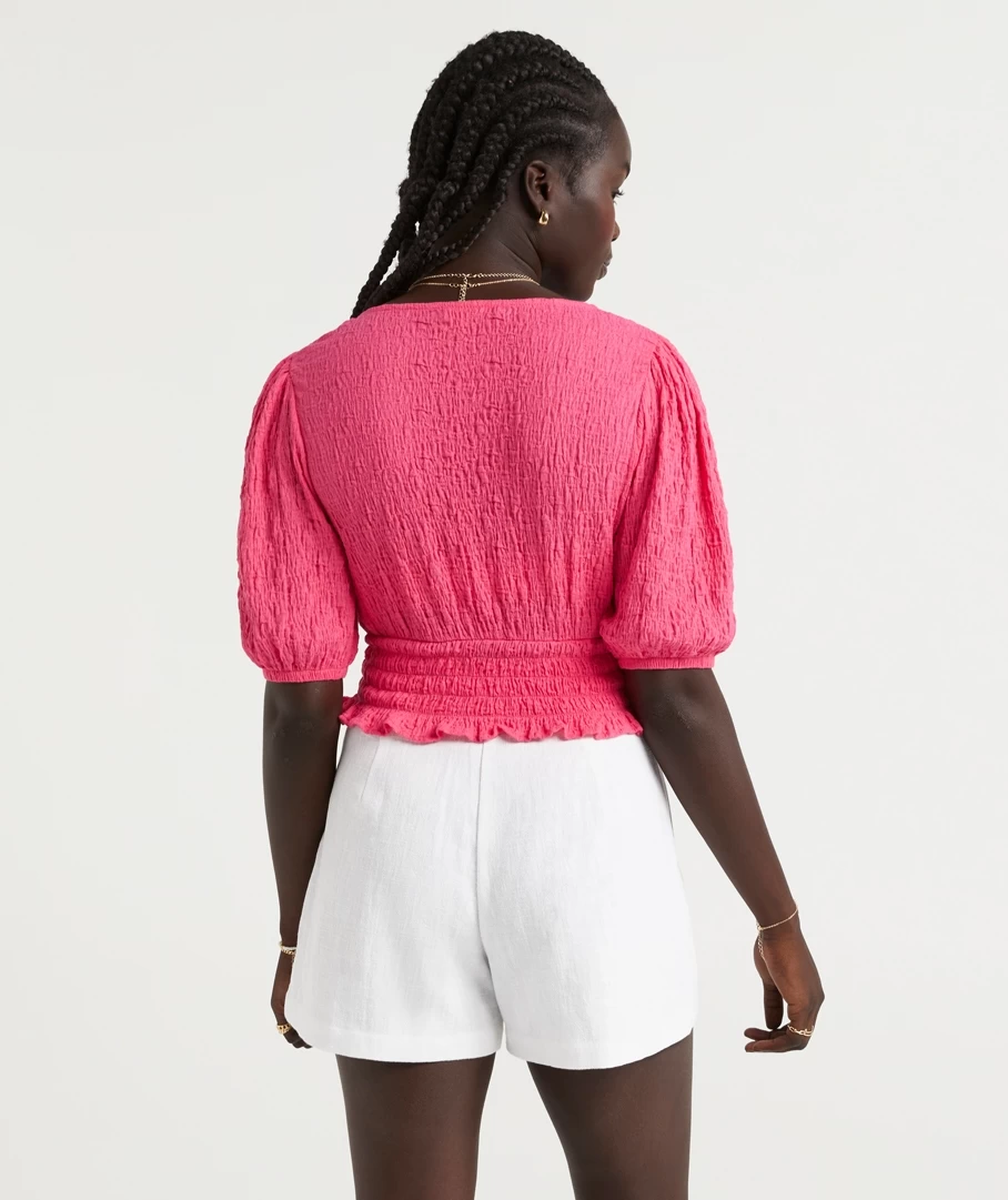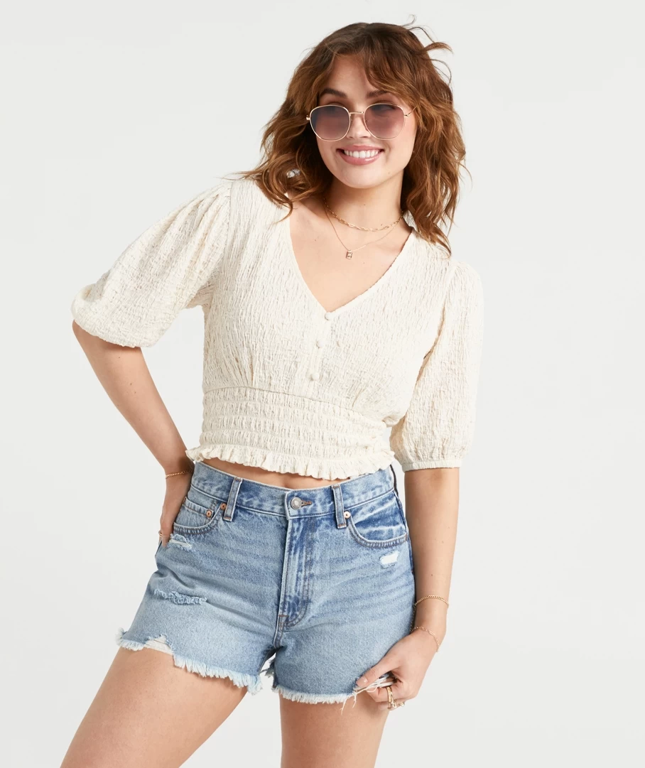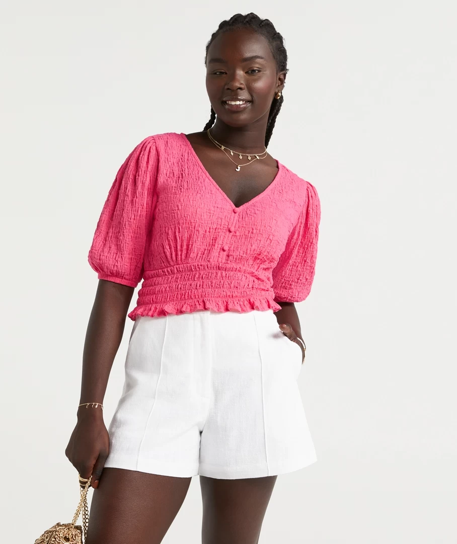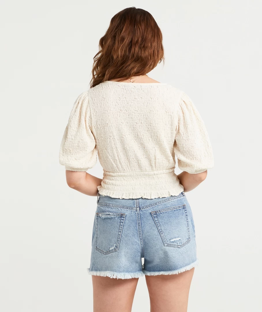 Wear it casual or glammed up, the Chrissy Textured Top can do it all. Made with a cotton blend, short cuffed sleeves, cropped length, shirred at the waist, buttons down the front and textured fabric. Pair with a pretty bag to complete your look.