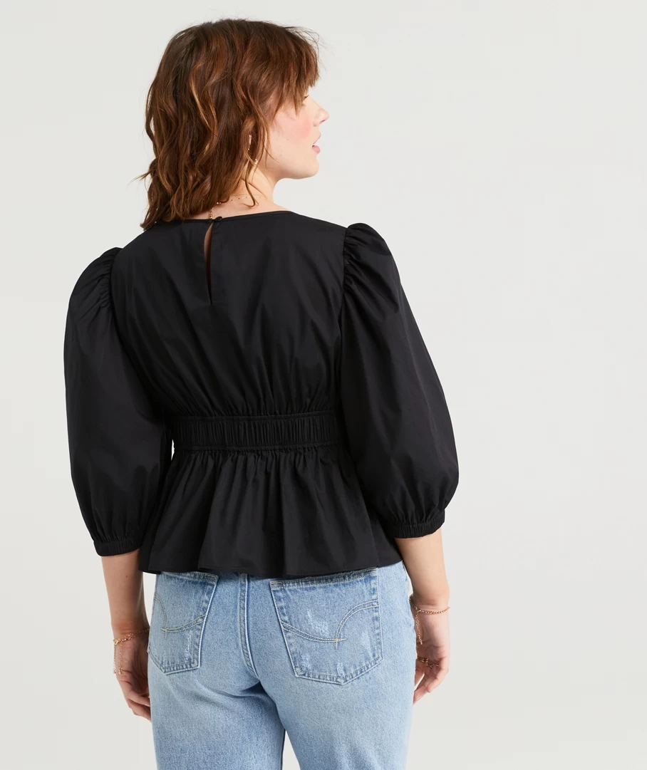 With cute puff sleeves, the Ciara V Neck Peplum Top is the one that will take you from day to night. This 100% cotton top features a V neckline, 3/4 length puff sleeves, keyhole & button back closure and waist detail with elastic back. Finish off your look with a necklace to elevate your look.