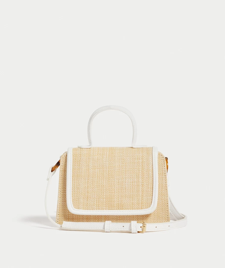 Whether you are off to a picnic or a girls day out, the Cleo Straw Crossbody Bag is the perfect pick. With a straw feel all over, white fabric hand strap, adjustable crossbody strap, tort plastic buckle detail, no internal pocket and flap over magnetic closure.