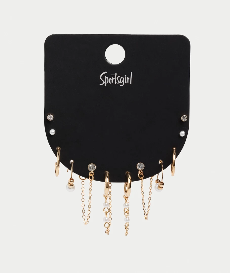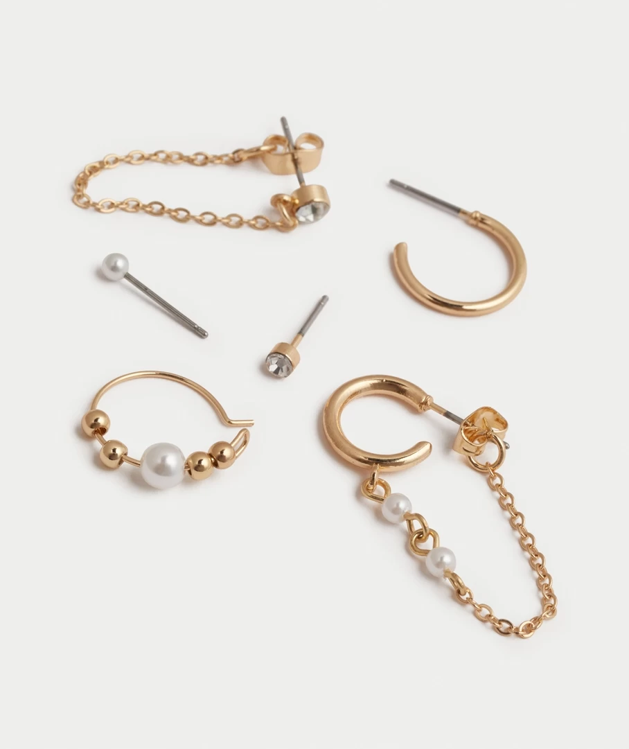 Mix and match with this Dainty Pearl Hoop Earring Pack. It features 6 pairs of earrings, so you can wear a new pair every day! They feature gold and pearl in studs, dangling and hoops.