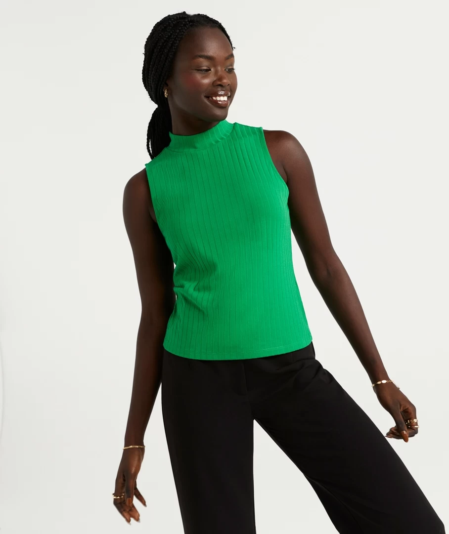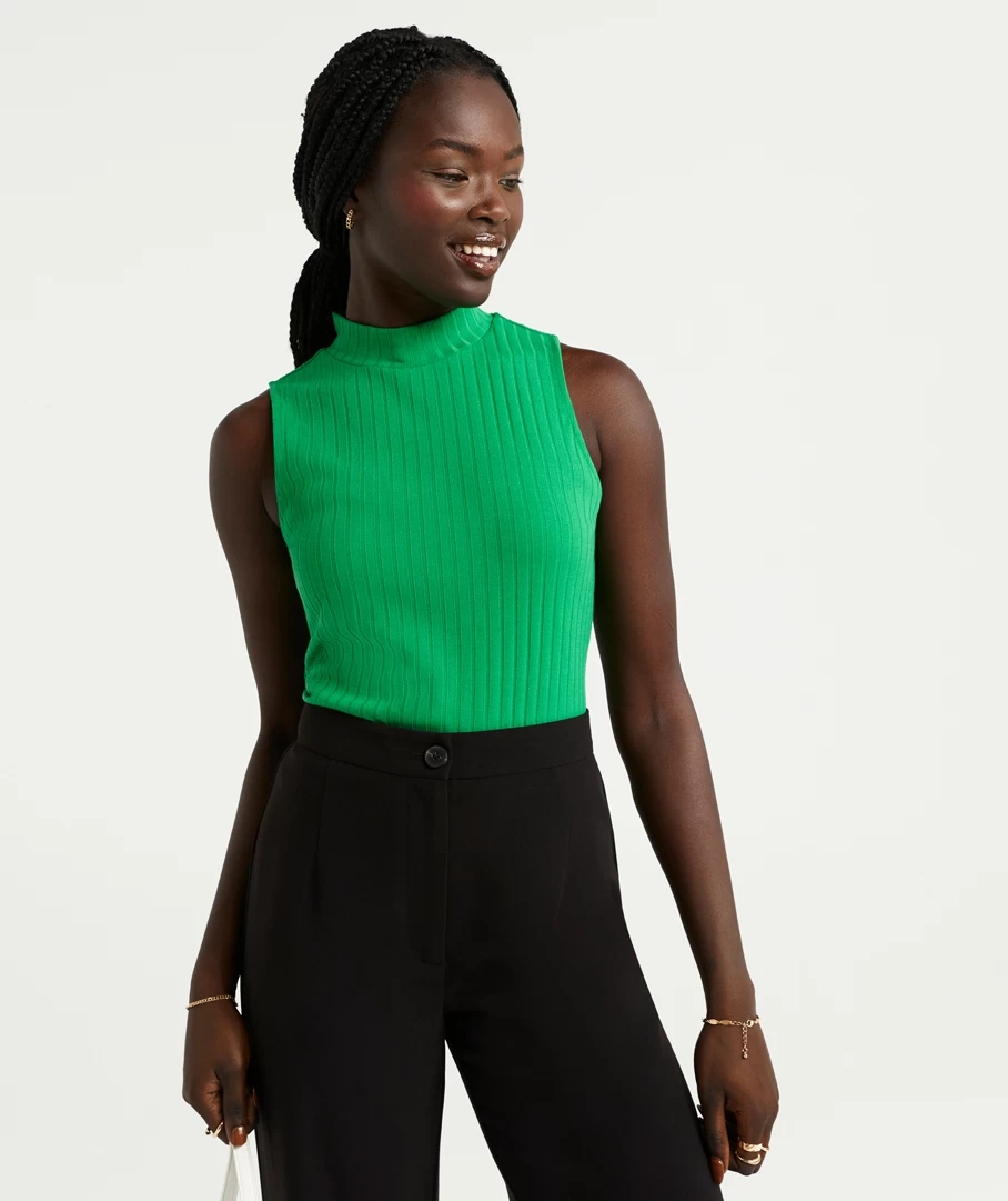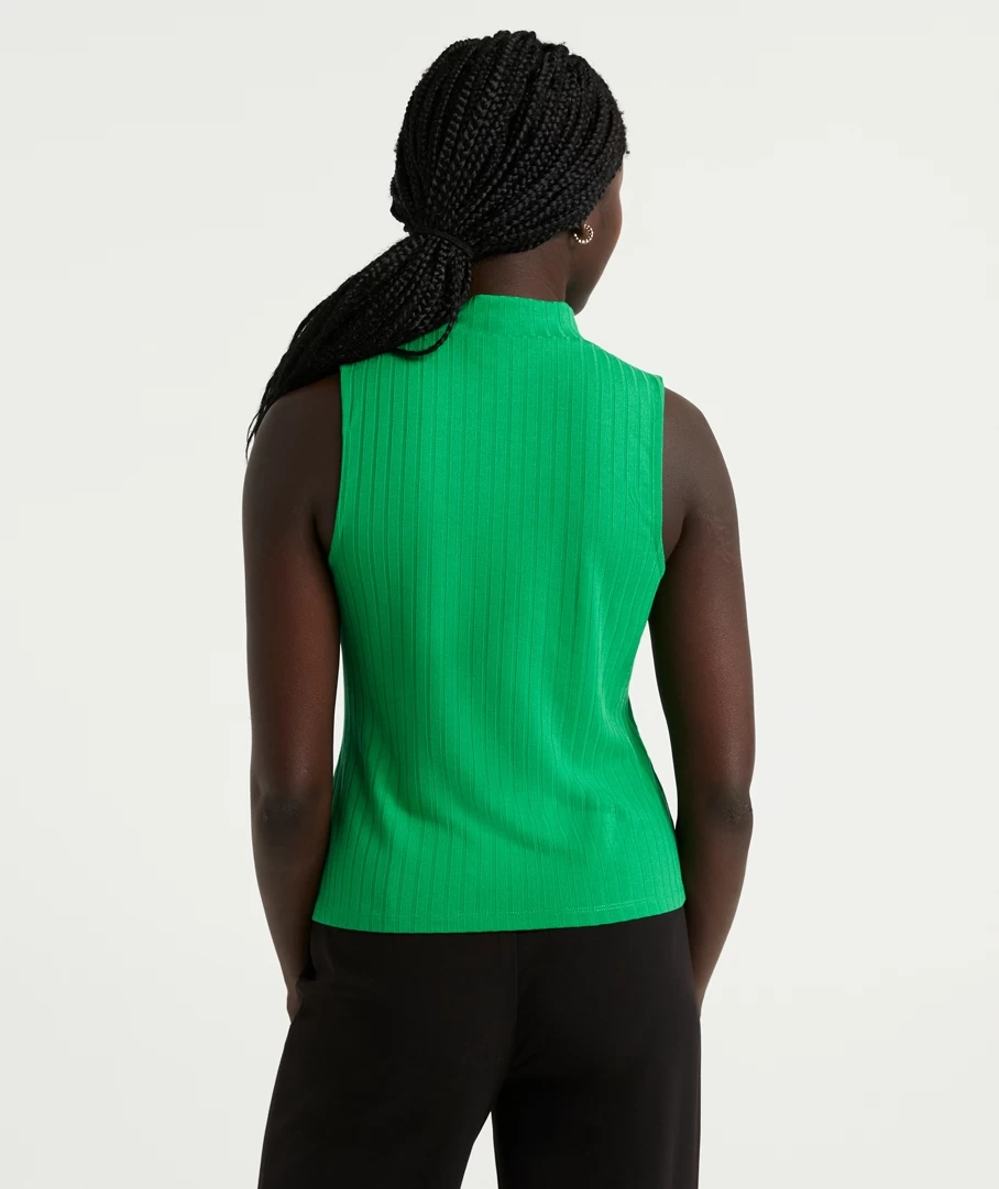 Elevate a casual look with the Evie Sleeveless Mock Neck Top. Made with lightweight fabric, full length, ribbing detail, mock neck and block colours. Pair with wide leg pants to complete your look.
