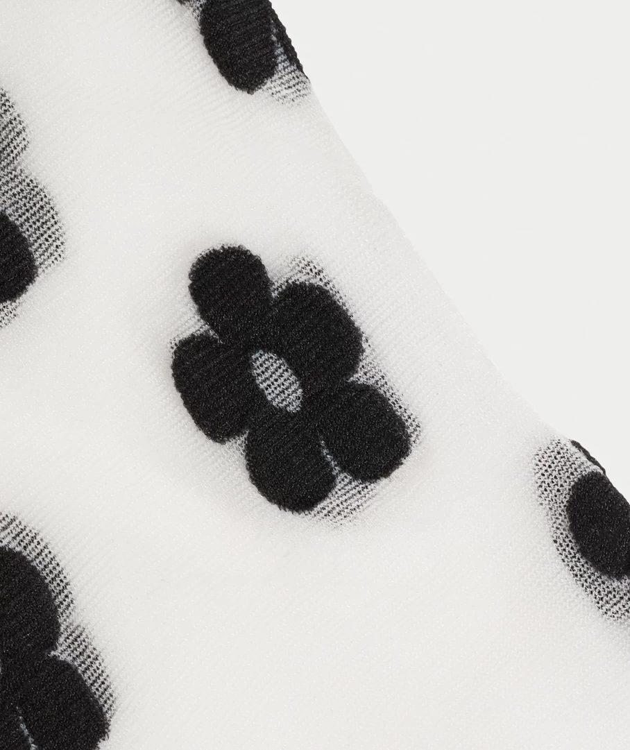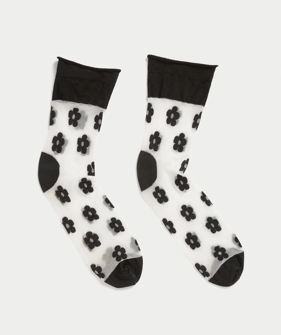 Treat your feet with the Floral Mesh Frill Sock. These socks will add some fun to your look. They feature a sheer mesh sock with a black floral print and frill trim, perfect for styling with our loafers!