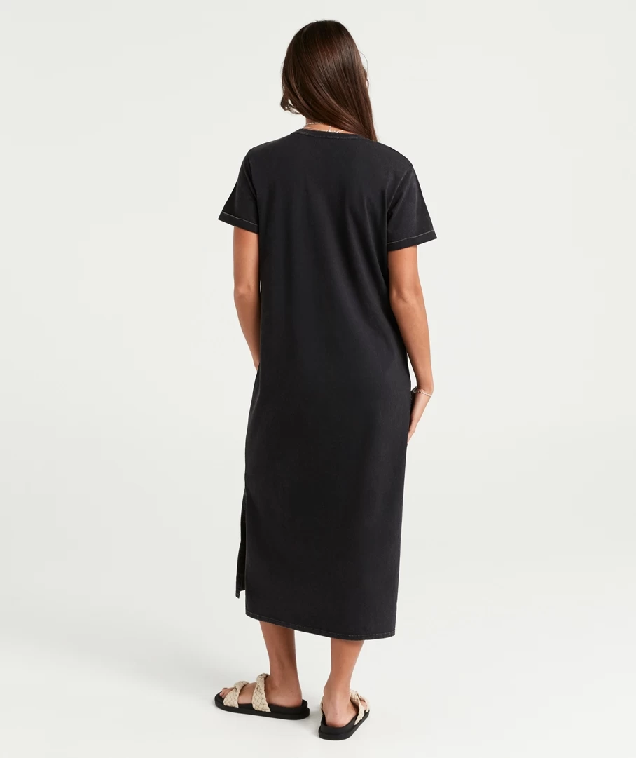 Take on the day with the Free Vibes Graphic Midi Dress. Made with 100% cotton, midi length, short rolled sleeves, split in both sides and washed black colour with a graphic in the center. Pair with your fave flats for a casual look.