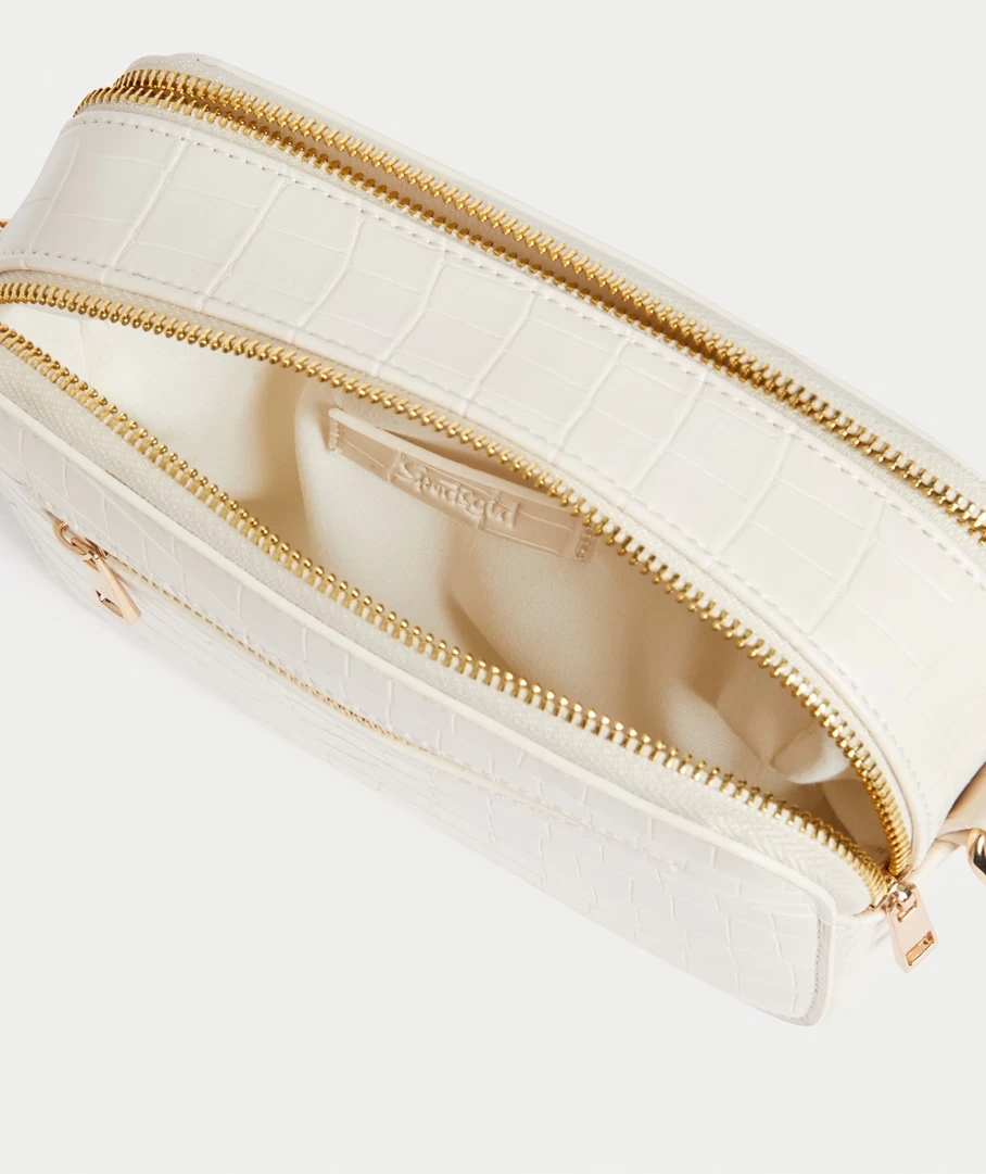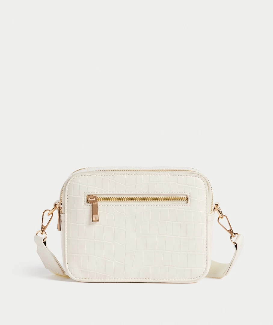 The Gemma Camera Crossbody Bag is perfect for everyday wear. Its features a faux leather look, front zip pocket, two zip closures, removable and adjustable crossbody strap and gold metal detail.