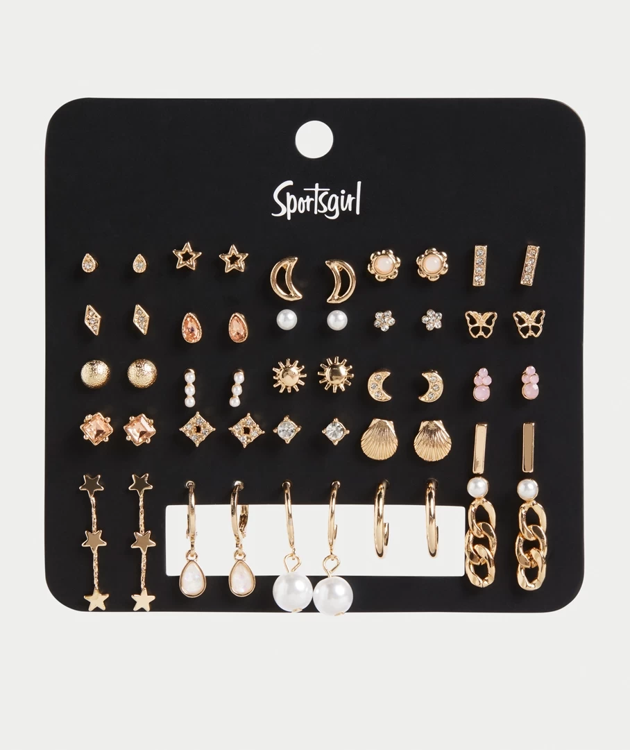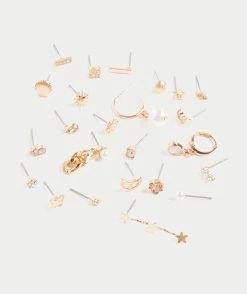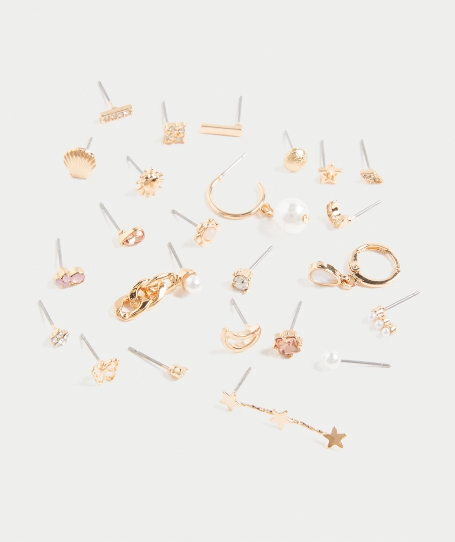 Mix and match with this mega Gold Crystal Stud & Hoop Earrings pack. They feature 25 pairs of earrings so you can wear a new one each day! They feature a gold colour and all have different shapes and sizes.