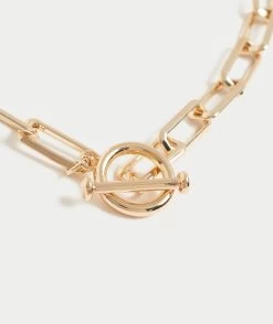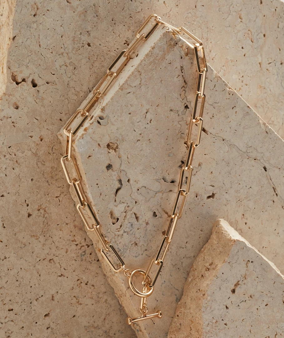 A timeless necklace, the Gold Plated Toggle Necklace. Featuring a gold chain and circle closure.
