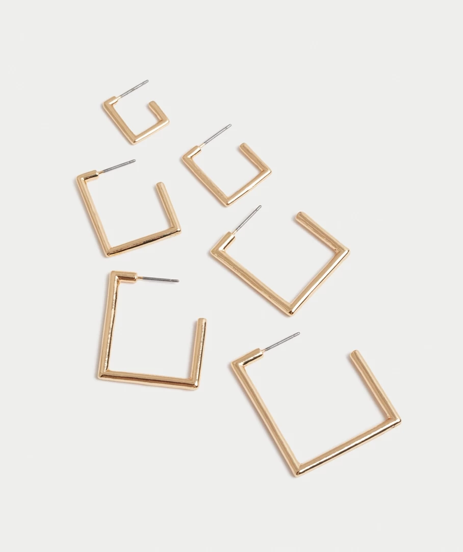 A staple earring pack, the Gold Rectangle Hoop Pack. Mix and match or wear them separate! Featuring 6 pairs of rectangle hoops.