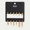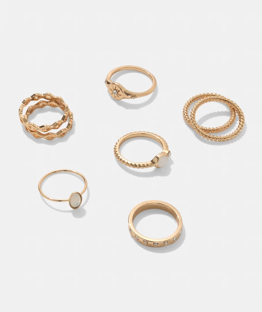 We are all about layering this season and that includes on your fingers! This pack features gold-coloured rings, all in different shapes and sizes. Wear them all at once or mix and match.