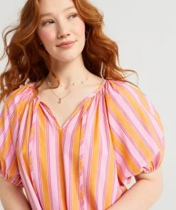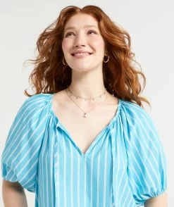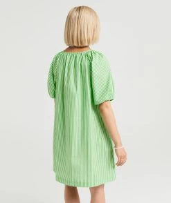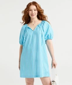 The Hanna Cotton Smock Mini Dress can be worn casual and dressed up! Made with 100% cotton, mini length, short puff sleeves, V neckline, tie front detail and stripe print all over. Pair with a pretty bag to complete your look.