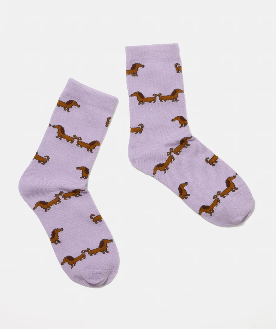 Treat your feet with the Happy Tails Sausage Crew Sock. These novelty crew socks will add some fun to your look. They feature adorable sausage dogs all over on a purple coloured sock.