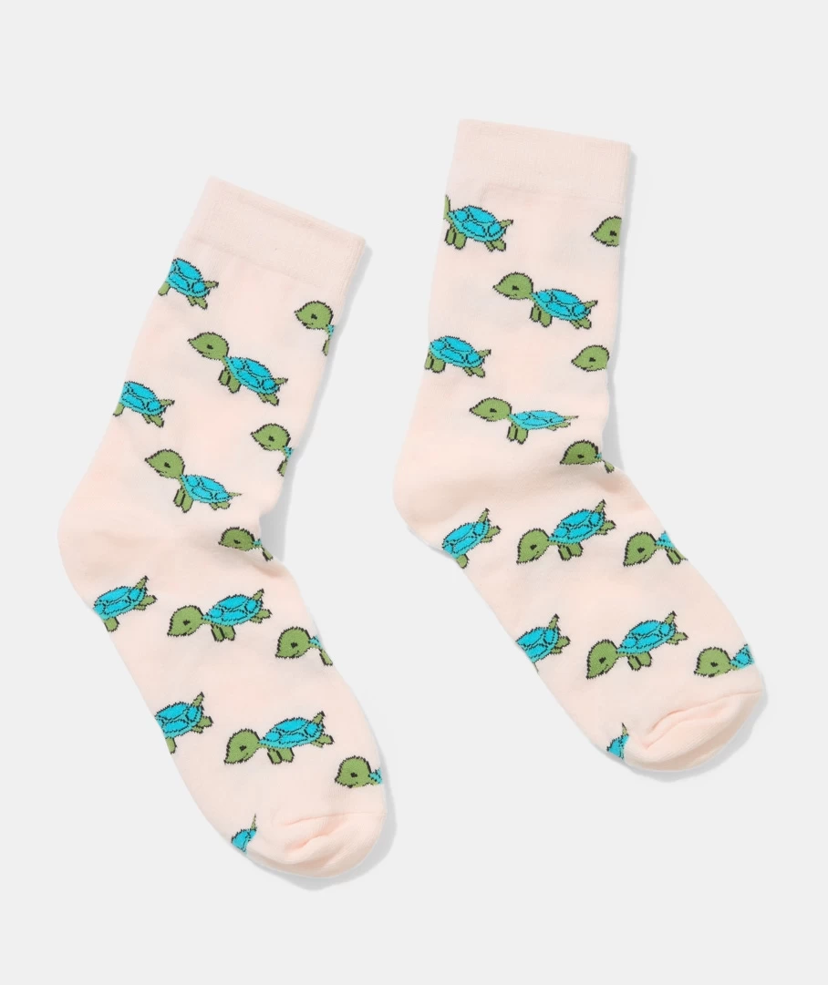 Stand out from the rest with these fun novelty socks! The Happy Turtle Crew Socks feature a light pink colour with smiley turtles all over.