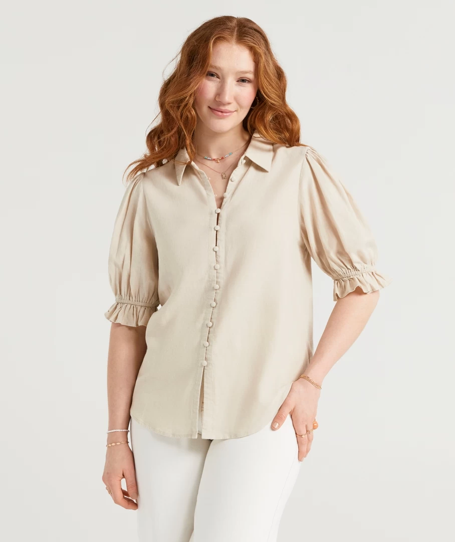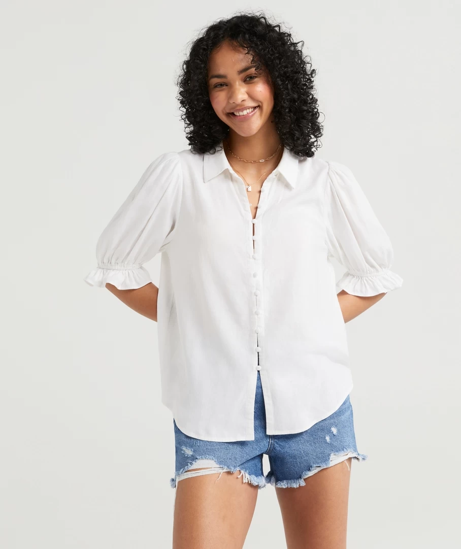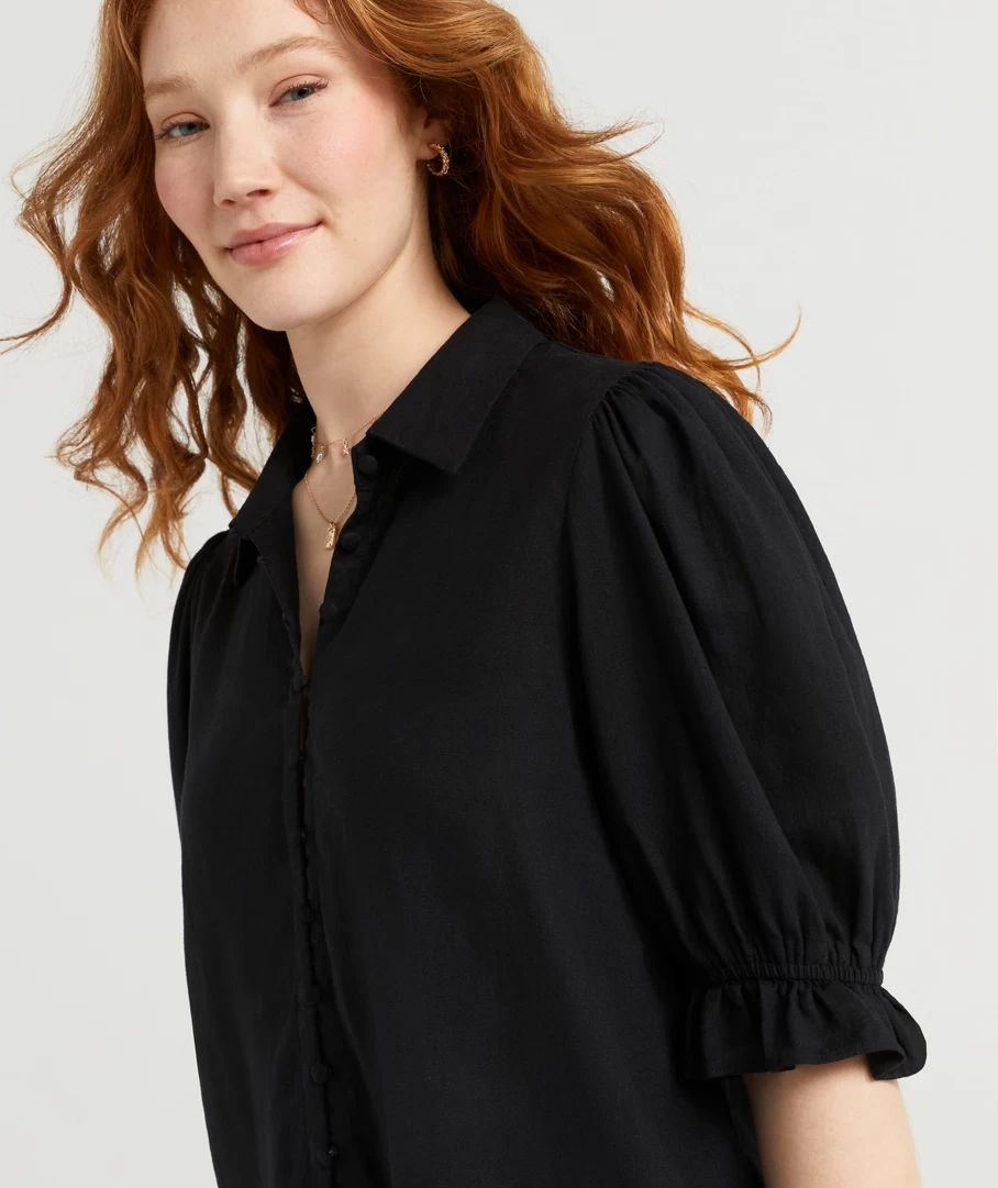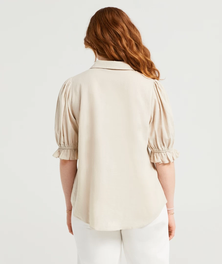 Our beloved Frankie Linen Shirt is here in a fun summer season version -The Harper Linen Ruffle Sleeve Shirt. With a linen blend, short sleeves with a ruffle hem, fabric buttons down the front, full length and pretty block colours. Pair with a pretty bag to complete your look.