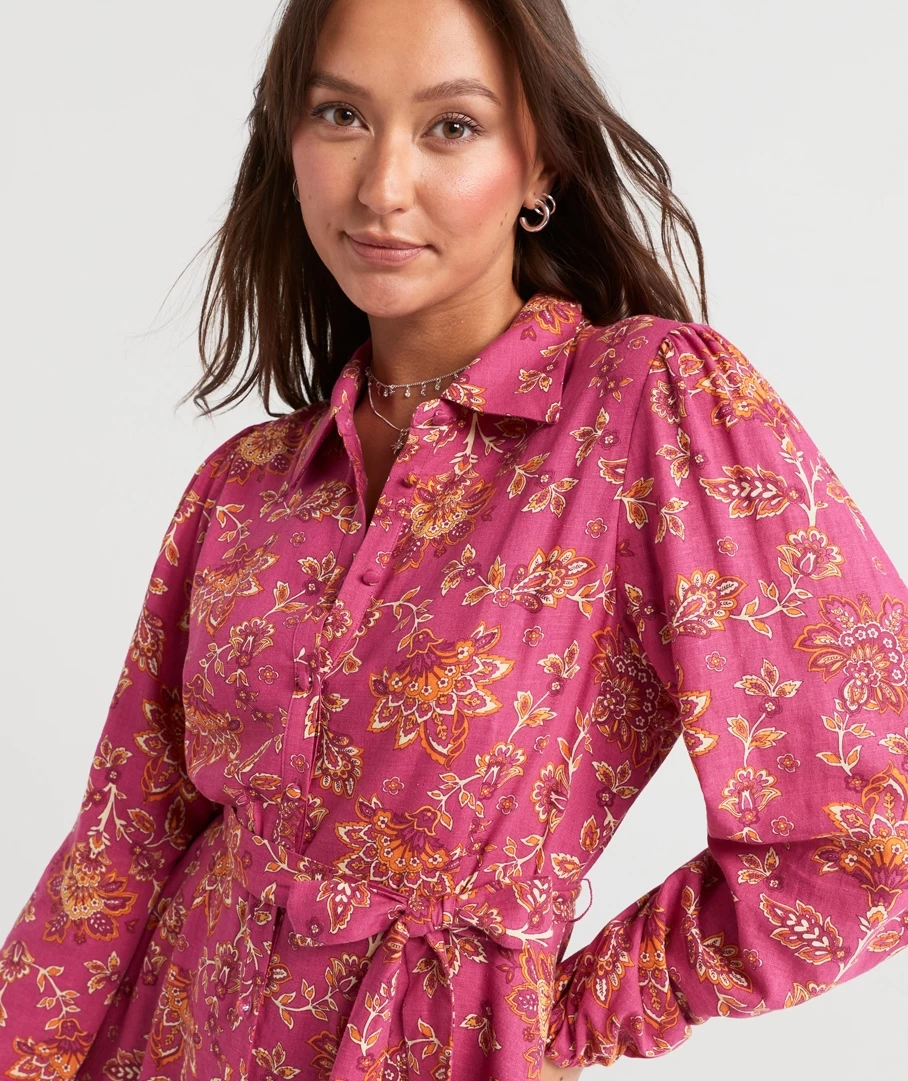 The Jacinta Button Down Mini Dress is the piece you will definitely not want to miss out on. Made from a linen blend, featuring classic shirt details such as buttons down the front and a tie waist belt. It can be easily dressed up or down with some heels for work or some sneakers for the weekend.