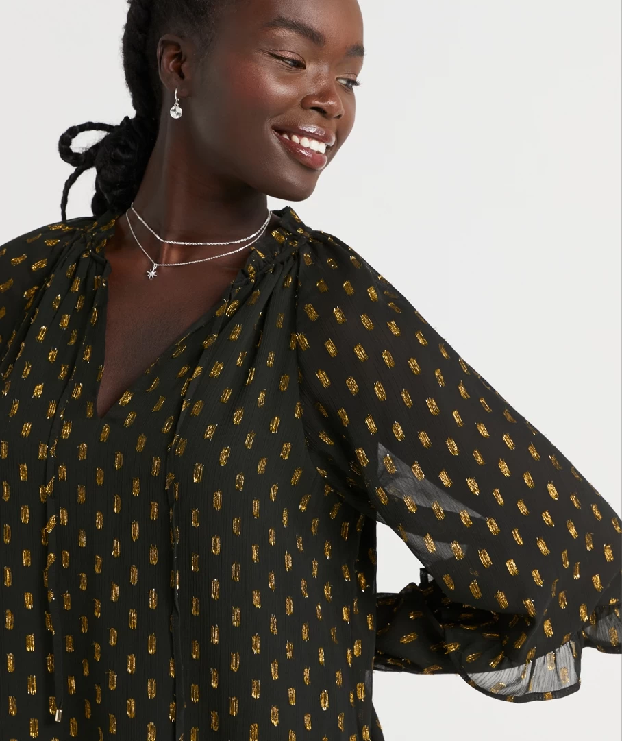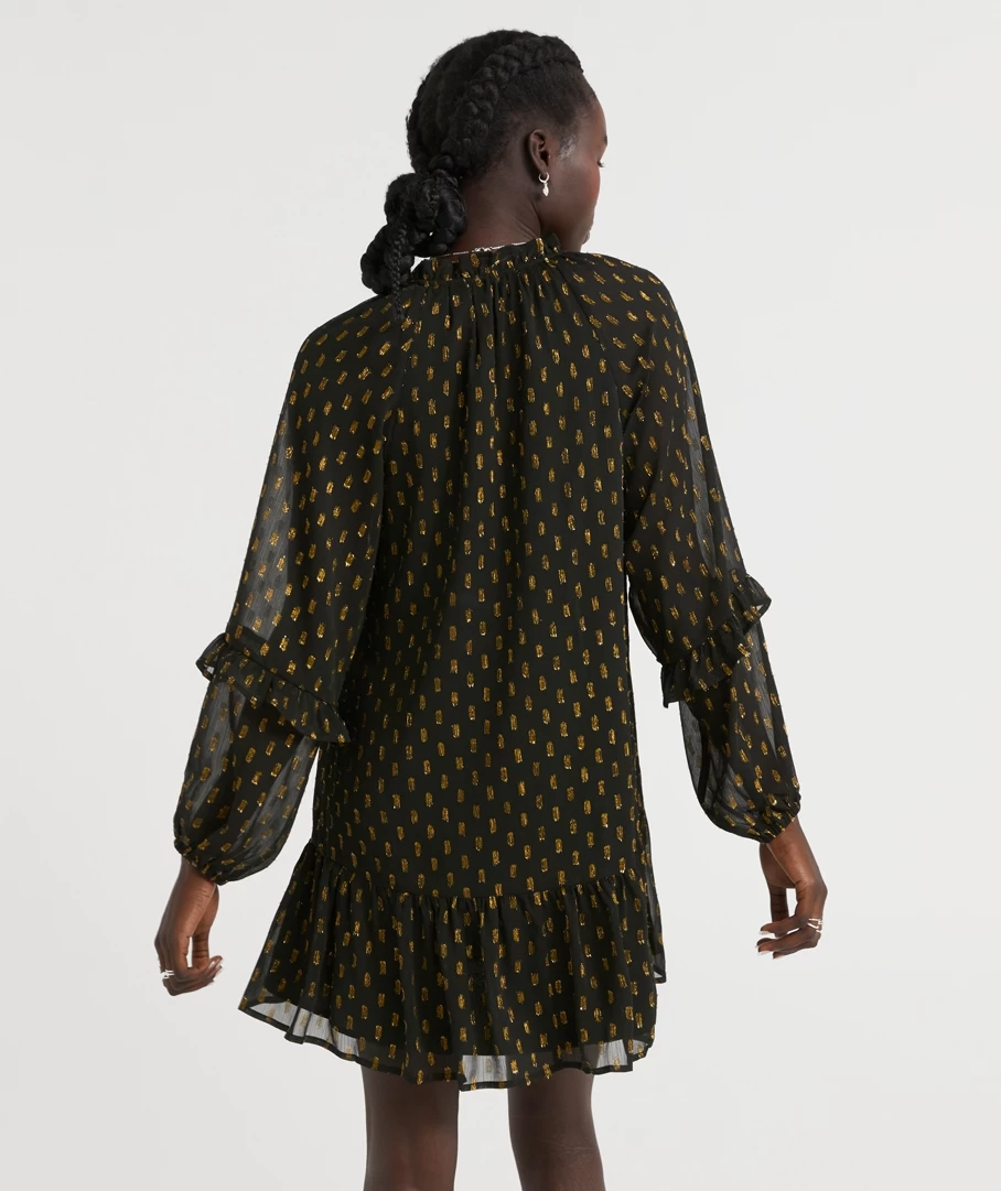 The Jasmine Lurex Ruffle Mini Dress is perfect for any night out! Featuring a sheer lightweight fabric with gold speckles. With a long sleeve and mini length. Style with boots to complete the oufit.