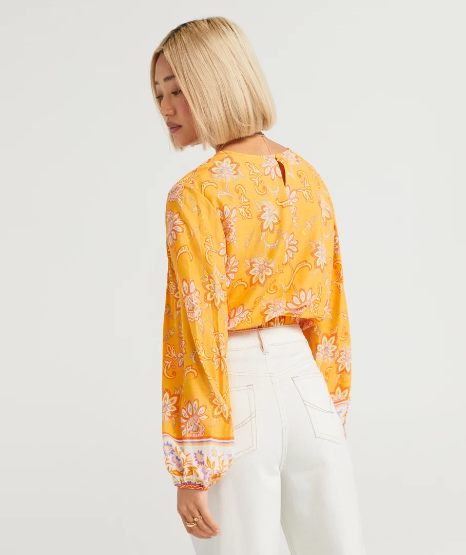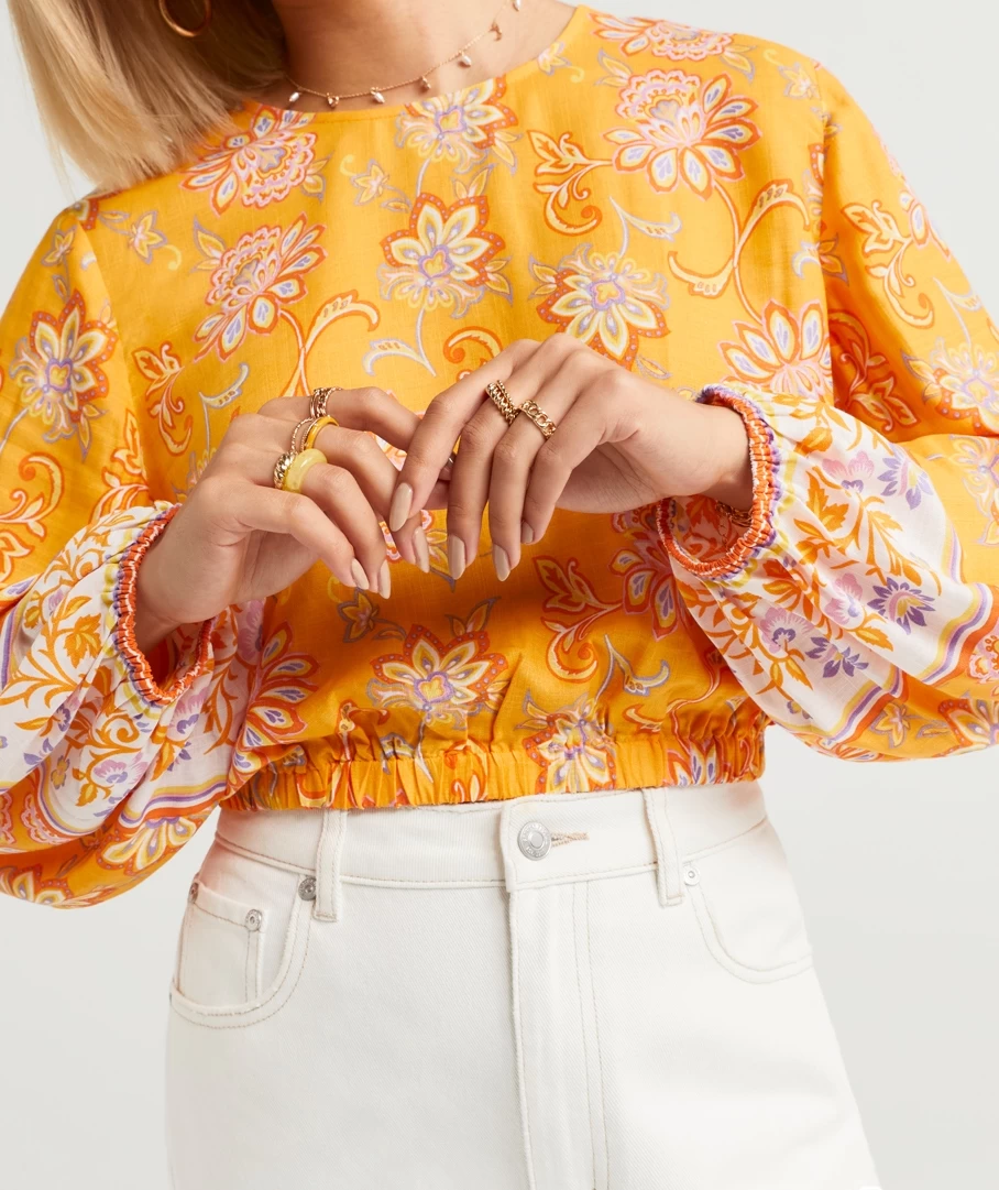 Stun with the Kai Ballon Sleeve Blouse, in a gorgeous floral print. With a linen blend, long puff sleeves, crop length, round neckline, elastic waist band and back button closure. Pair with a pretty bag to complete your look.