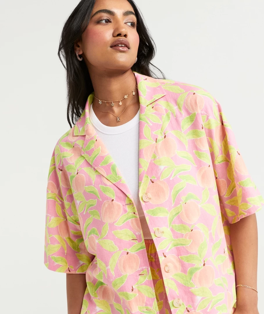 Get into the holiday mode with the Keiko Printed Resort Shirt. Made with a linen blend, short sleeves, buttons down the front and fruit print all over. Pair with its matching resort shorts for the ultimate set. Add a crossbody bag to finalise your look.
