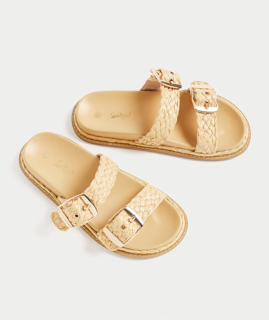 Get into the summer feels with the Kendall Natural Espadrille Braided Slides. Made with a raffia fabric, two front straps, gold coloured buckles, peep toe and open back.