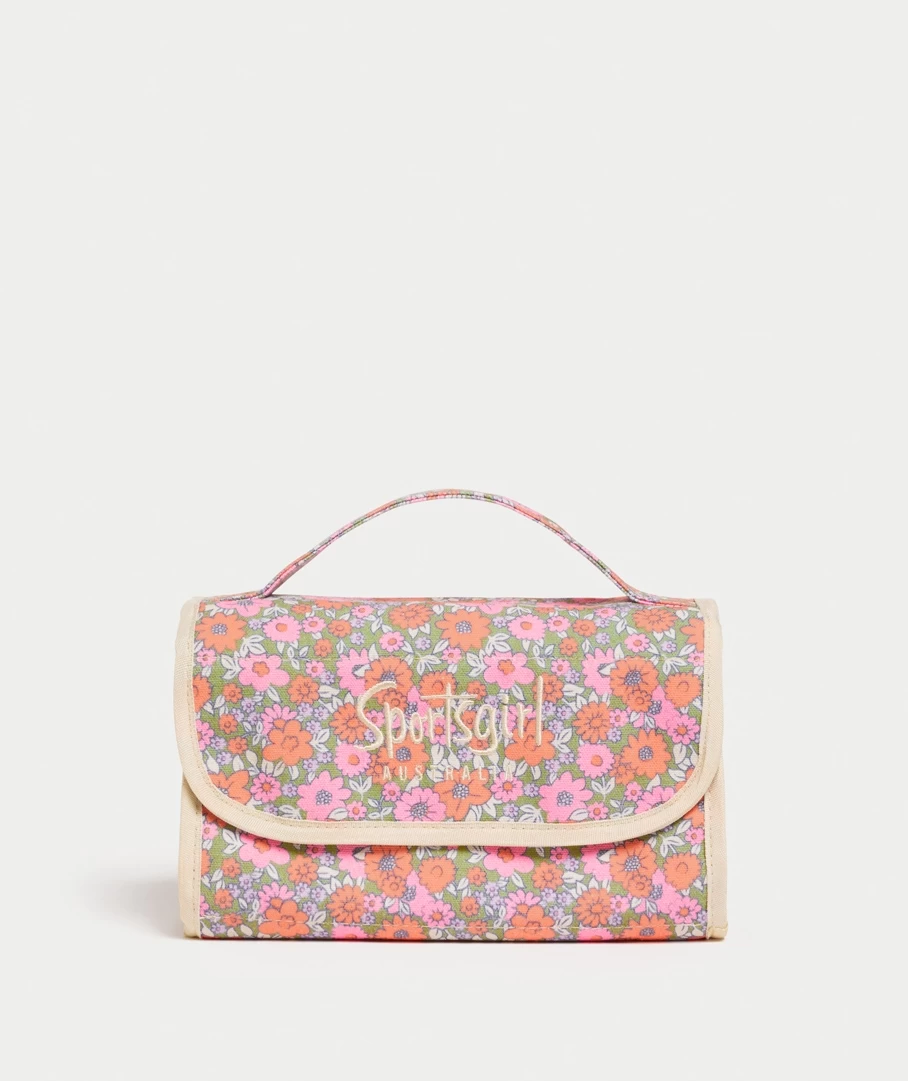 Travel with all your goods secured in this Sportsgirl Fold Out Travel Beauty Case. Made with 4 separate zip up compartments, flap over magnetic closure, floral colour and the Sportsgirl logo embroidered on the front.