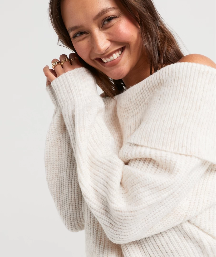 Stay warm and cosy in the Lorna Off Shoulder Knit Sweater. Featuring an off the shoulder detail, slouchy fit, in a full length ribbed knit. Perfect for pairing with jeans to complete your outfit.