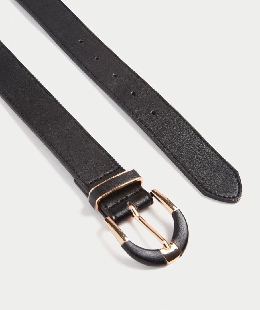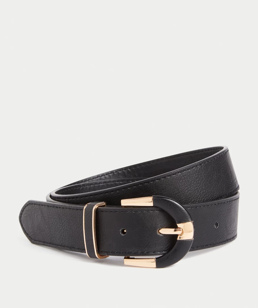 The Lucy Covered Buckle Belt features a leather look, gold coloured metal detail, one belt hoop and round buckle.