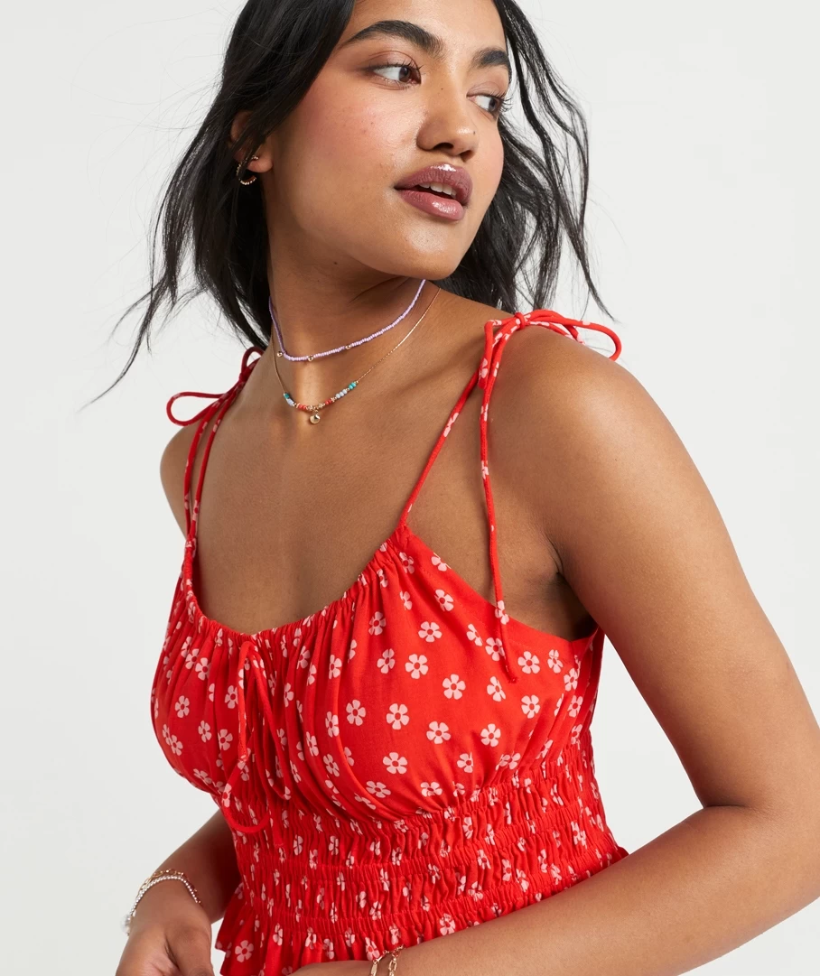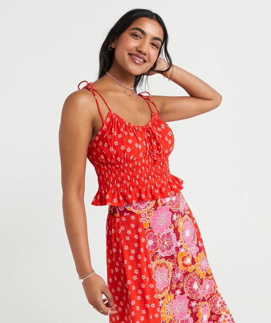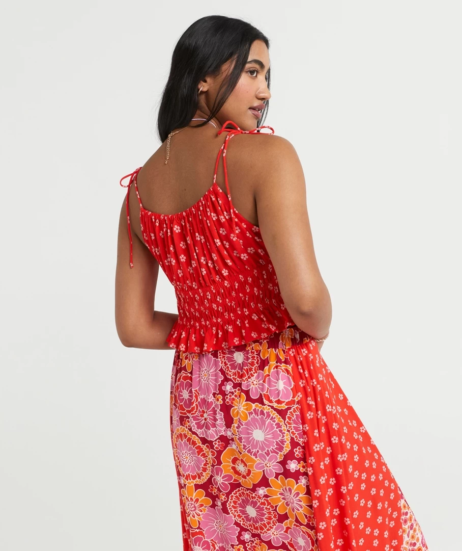 Its all in the detail with the Mina Printed Cami. Made with a lightweight fabric, cropped length, thin tie detail straps, relaxed fit, tie front detail and a pretty print all over. Pair with its matching Alexis Spliced Midi Skirt for a fun set look. Add some new slides and you are set.