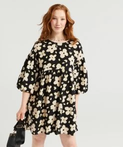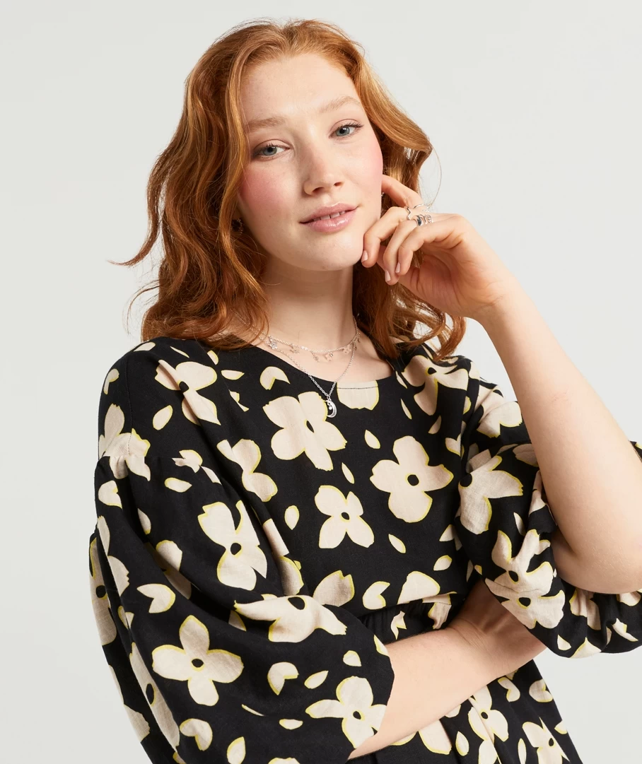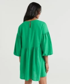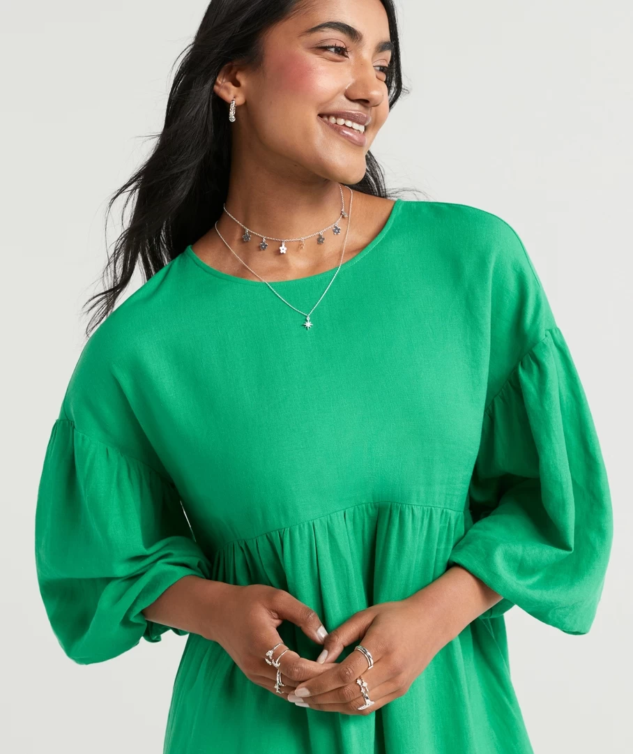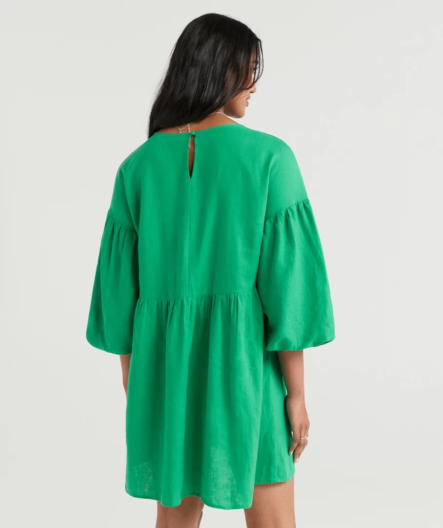 You will be reaching for the Natasha Linen Balloon Sleeve Dress all season long. Made with a linen blend, mini length, short balloon sleeves, high neckline and back button closure. Pair with new slides to complete your look.
