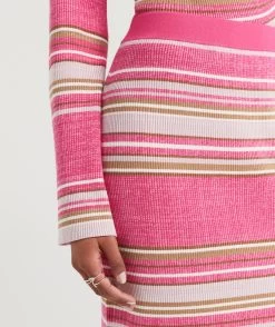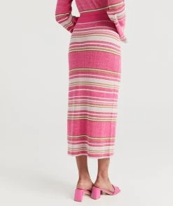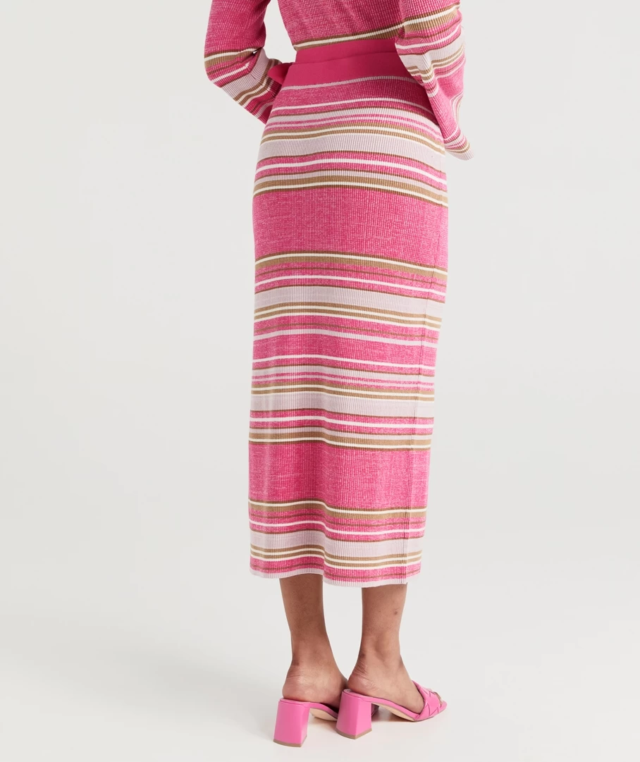 The perfect mix of casual and dressed up with the Nova Knit Skirt. Made with a blend of lightweight materials, the perfect option for any occasion. Features a midi length, side slit and in a pattern stripe print. Pair with the matching Nova Wrap Knit Top for a complete set.