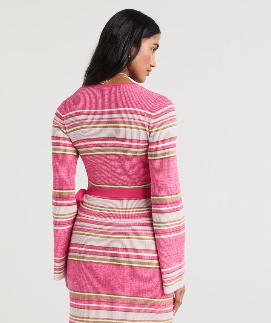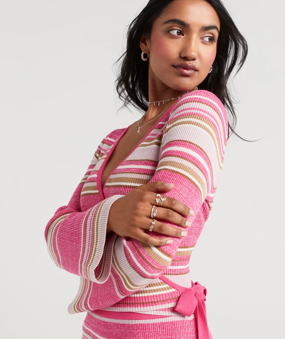 For a dressier moment, the Nova Wrap Knit Top is the perfect pick. Style with jeans or even the matching skirt for a look to take you from day to night. Featuring a wrap style tie, stripe print, flared sleeves and a V neck collar. Pair with heels to elevate your outfit.