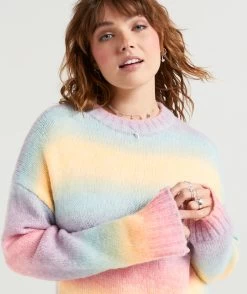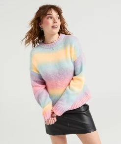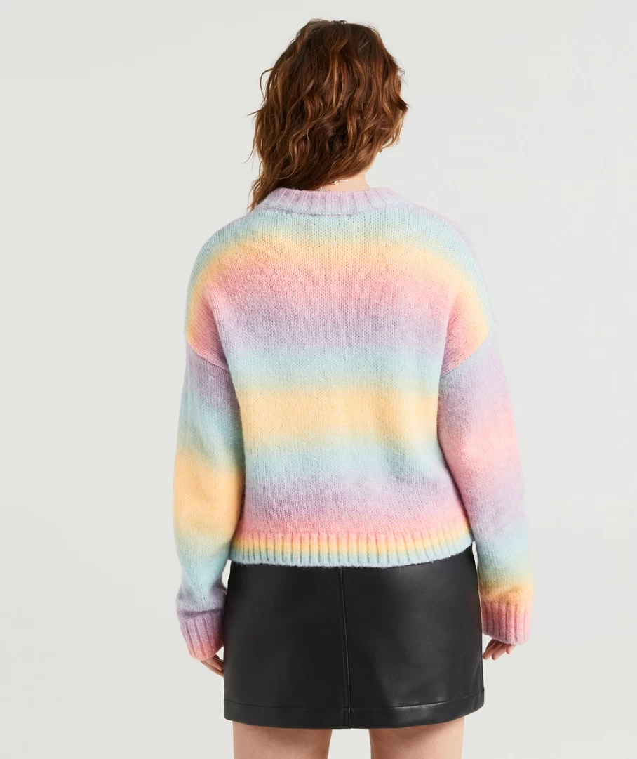 Add a pop of colour to your wardrobe this season with the Pia Rainbow Ombre Knit Sweater. A soft, wool blend knit featuring a pastel rainbow pattern, full length sleeves and high neckline. Style with jeans for a casual everyday look.