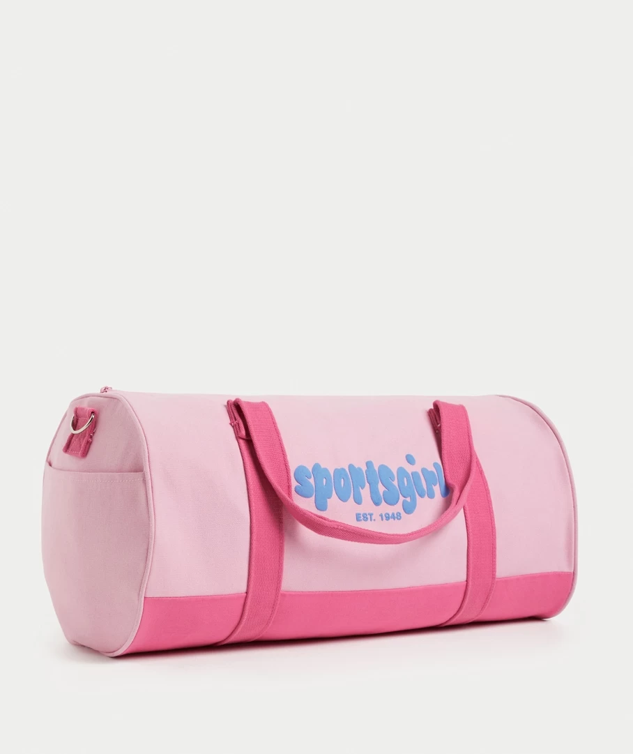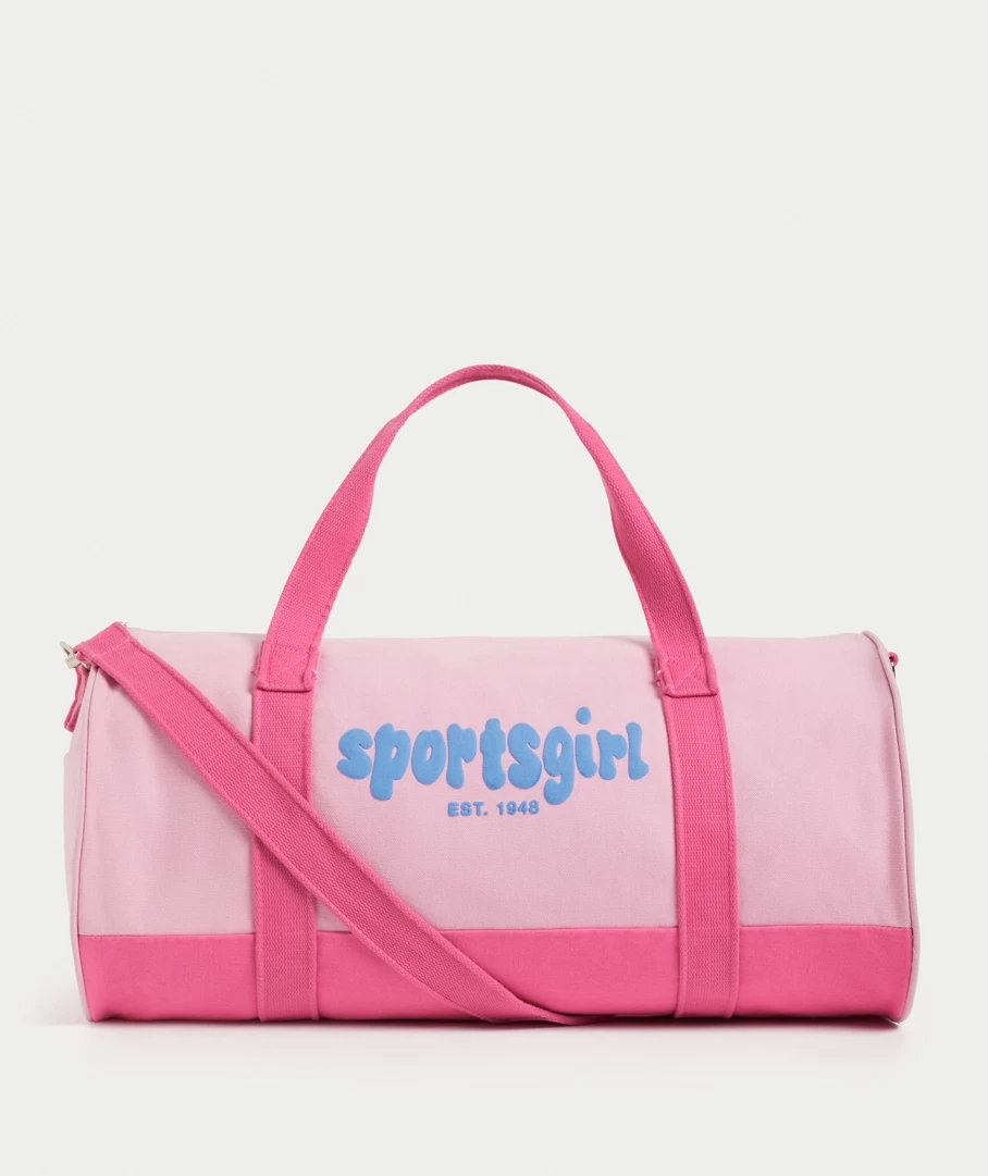 Pack in style with the iconic Jacqaurd Rewind Duffle Bag. Designed with a cotton blend, tunnel shape, two shoulder straps, a removable & adjustable crossbody strap, side pockets, zip closure and the Sportsgirl logo printed on the front. Carry all your goods in this spacious and durable duffle bag.