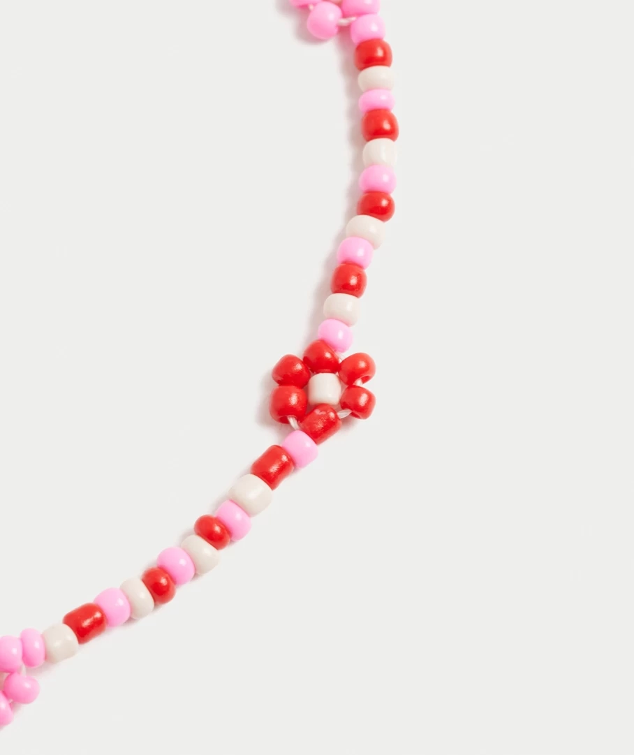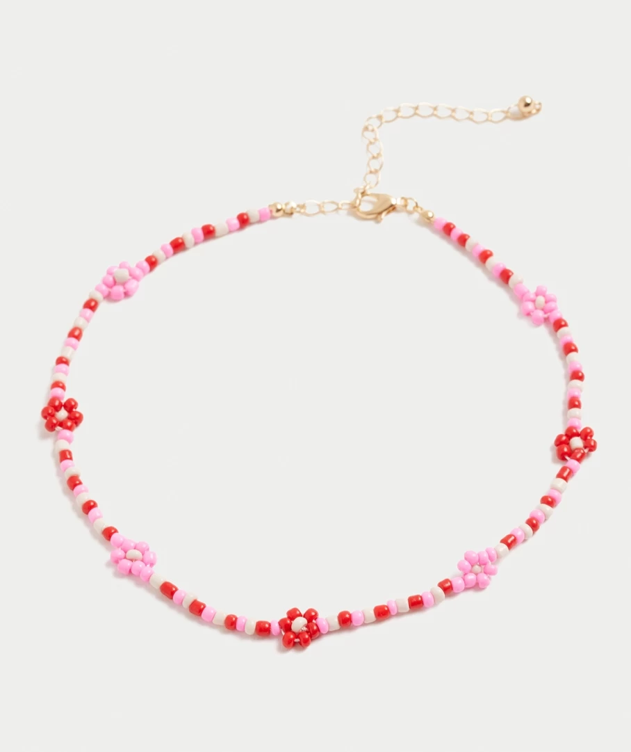 We are loving beads this season and the Pink Daisy Chocker Necklace is a must have. With pink and red beads in a floral pattern.