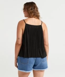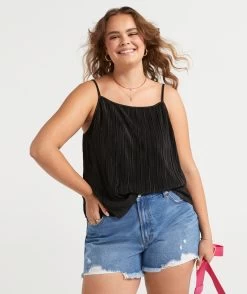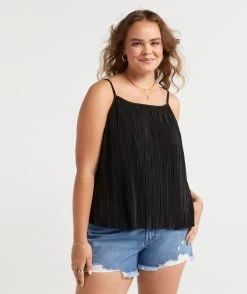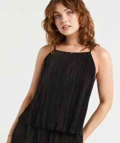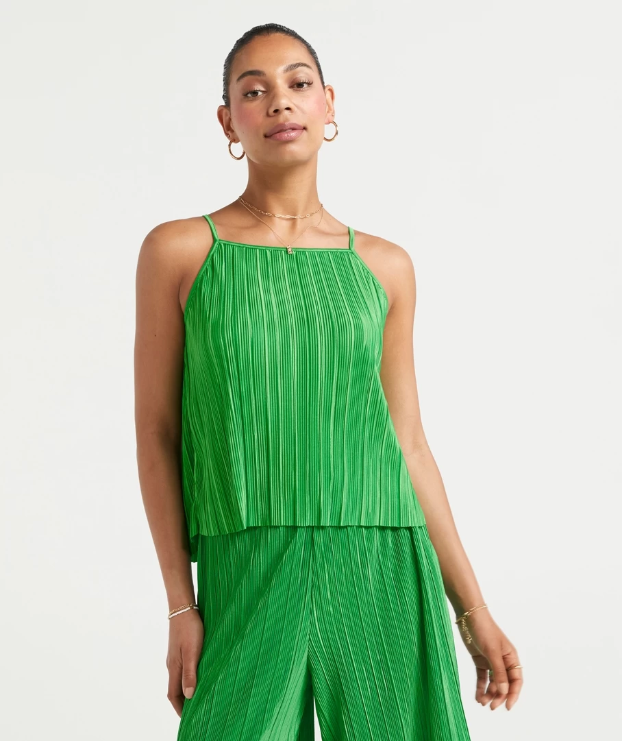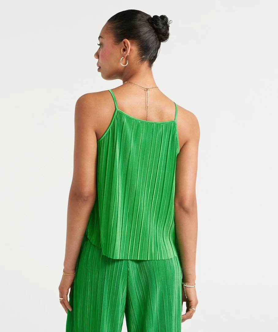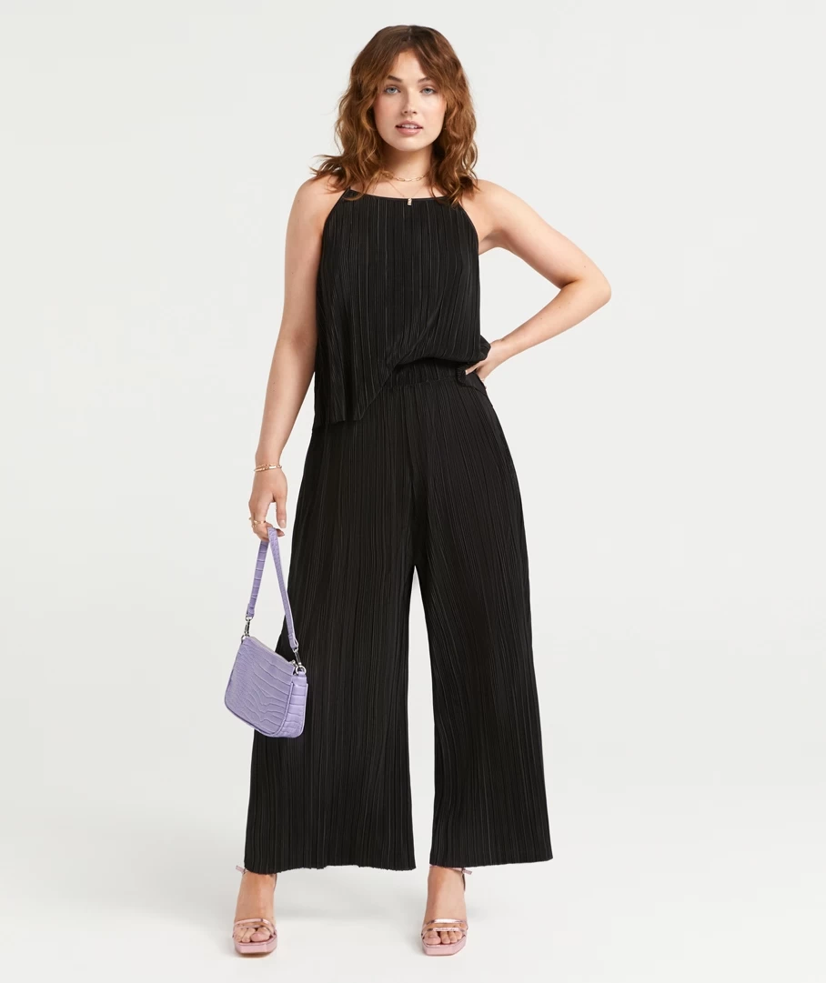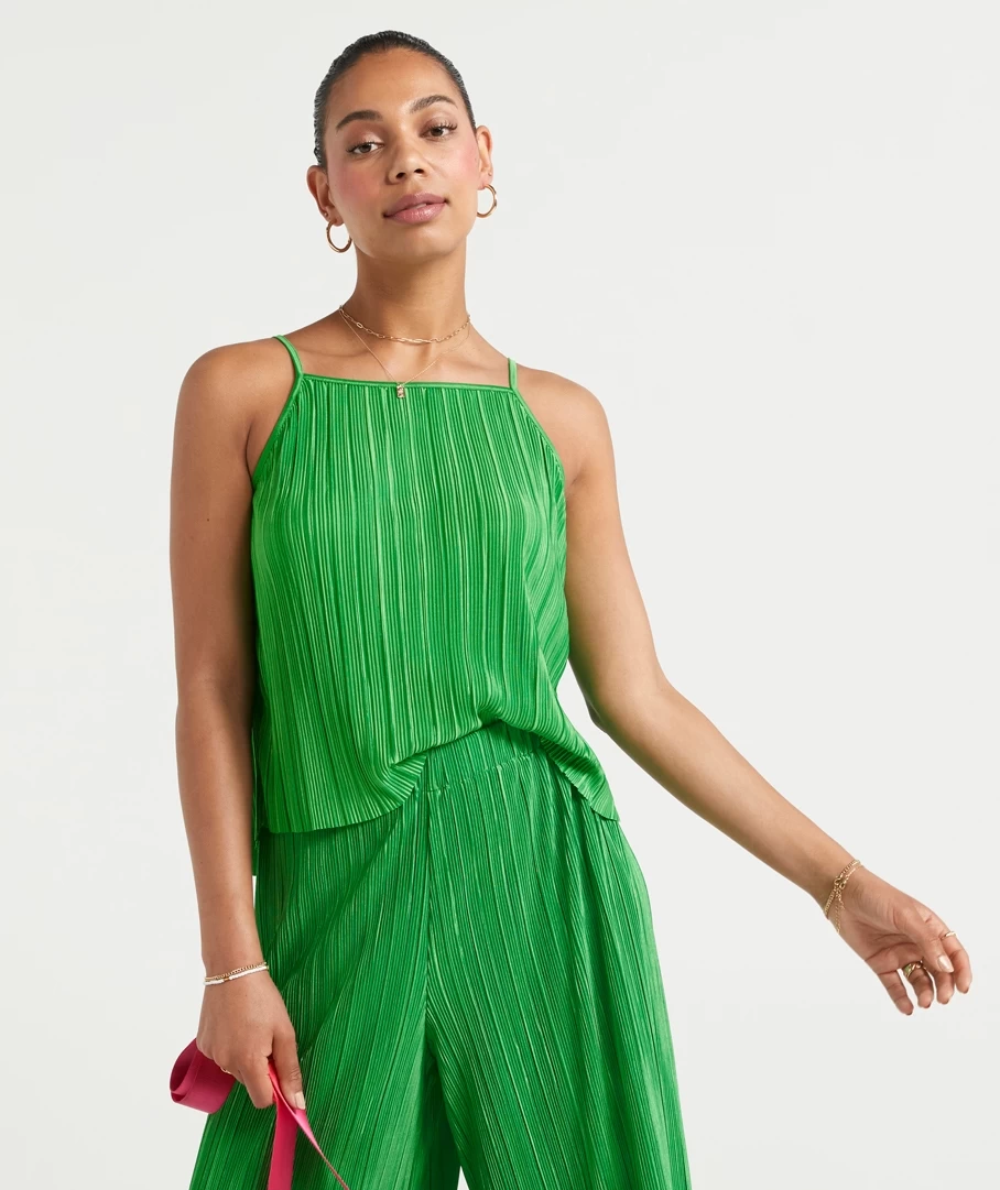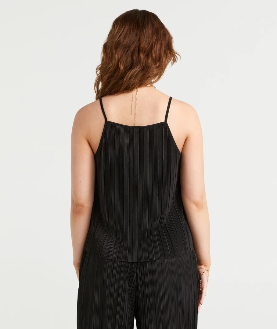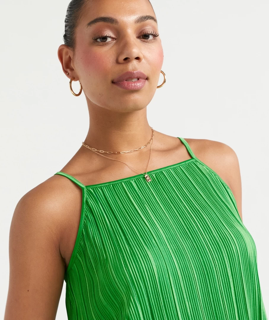 You will be reaching for the Plisse Pleated Cami Top all season long. Made with a lightweight fabric, it can be worn casual during the day and glammed up at night. With a shiny plisse fabric, thin straps, square neckline, loose fit, full length and block colours. Pair with matching plisse culottes for a set look. Add a pretty bag to complete your look.