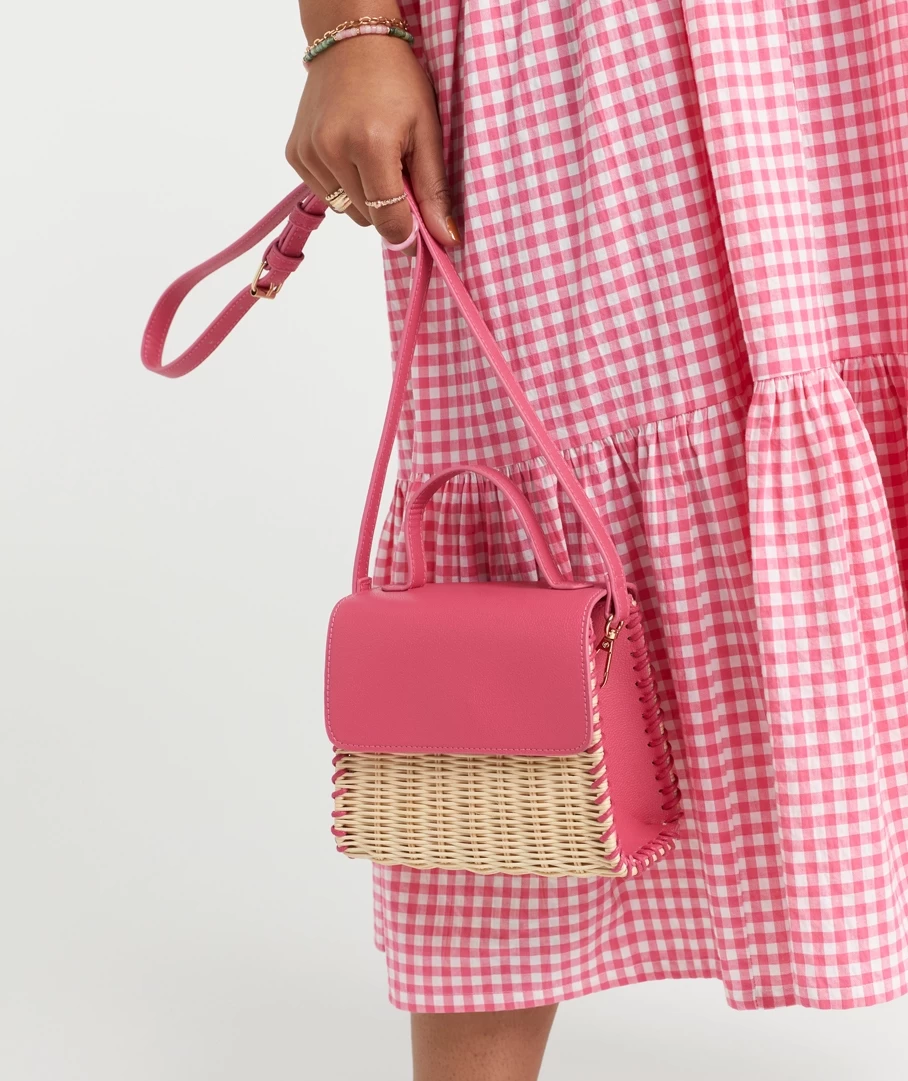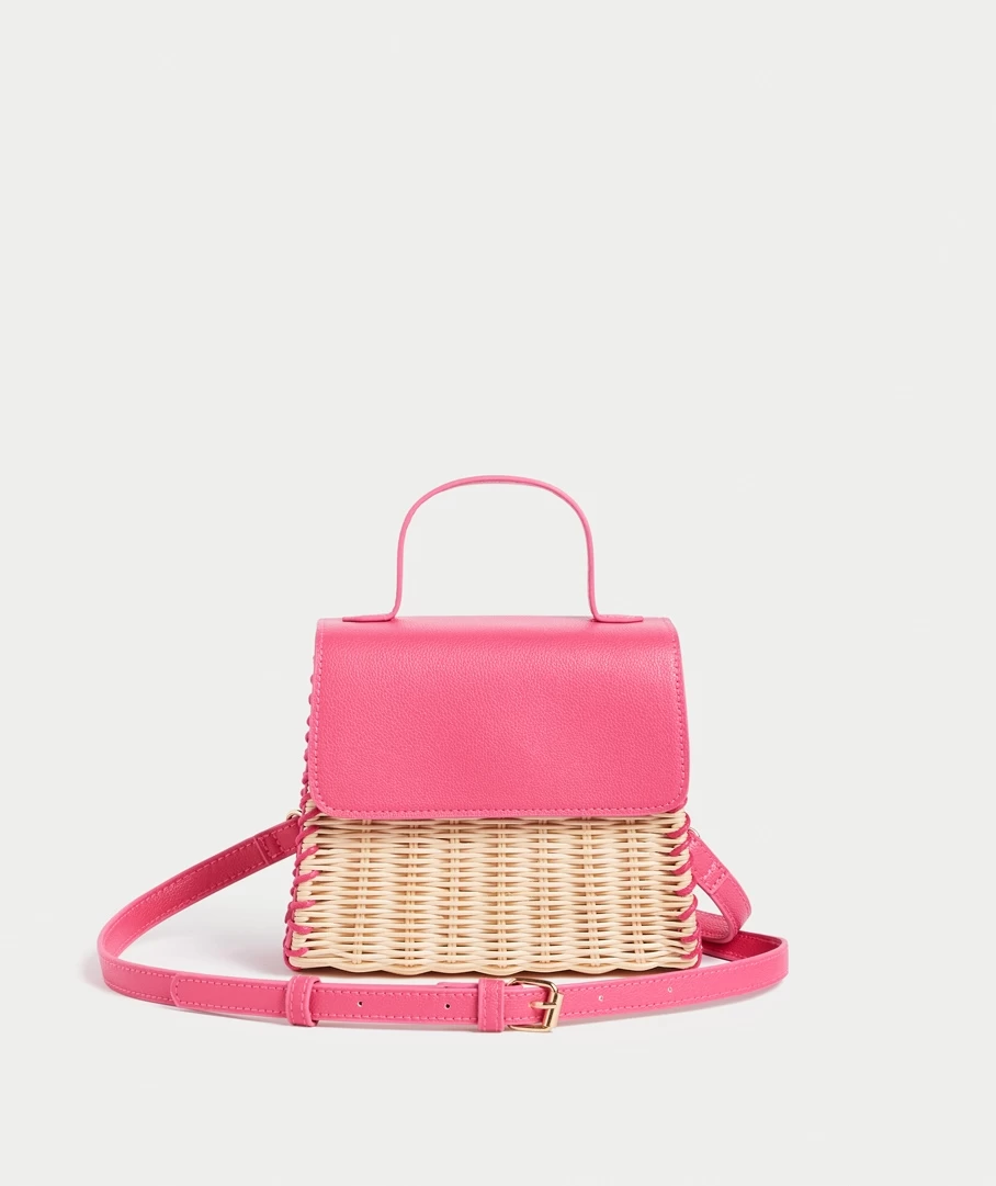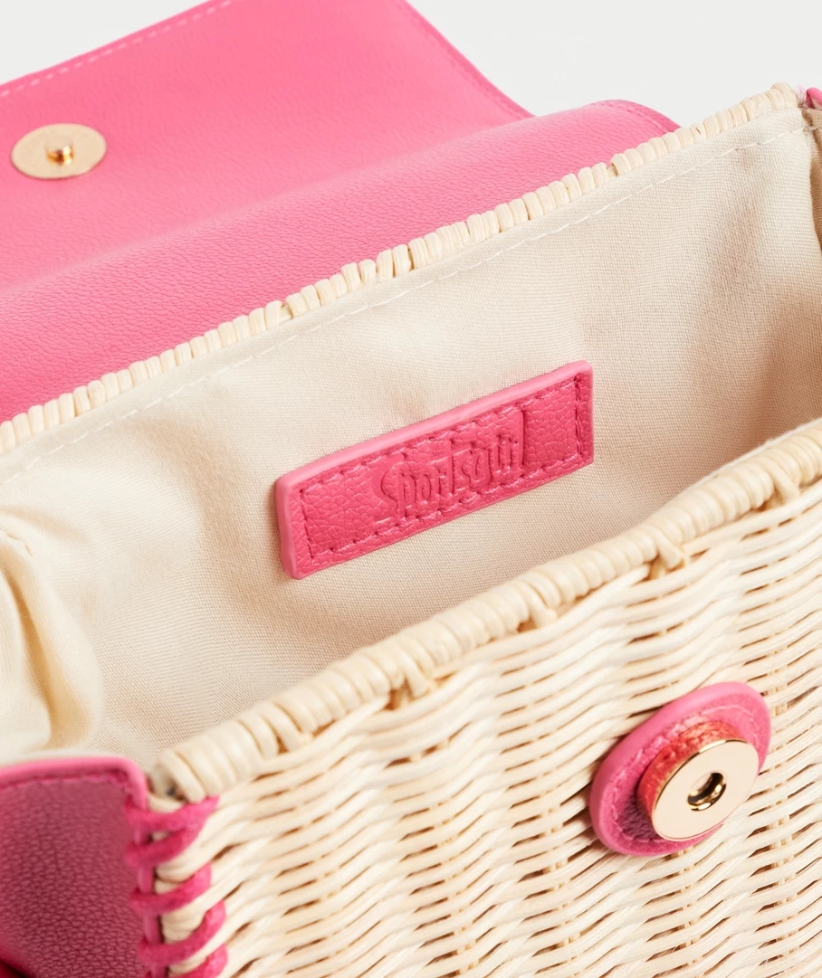 With a straw and leather look mix the Poppy Wicker Mini Bag can do it all. Wear it dressy or casual, this mini bag is a keeper. Designed with a cute square shape, removable & adjustable crossbody strap, internal fabric, flap over magnetic closure and fun hot pink colour.