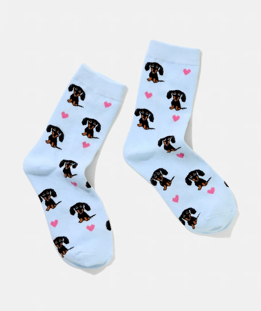 Treat your feet with the Puppy Love Crew Sock. These novelty crew socks will add some fun to your look. They feature puppies and love hearts all over in a soft blue colour.