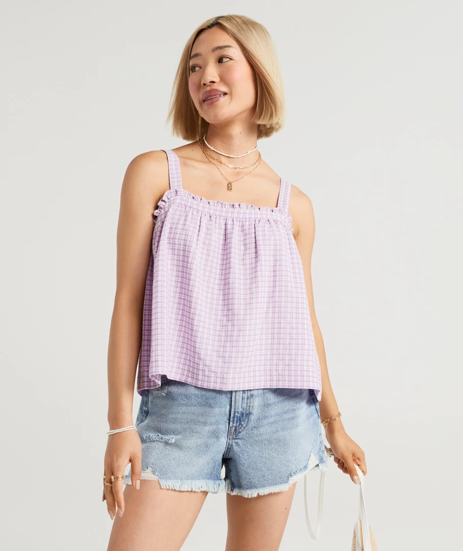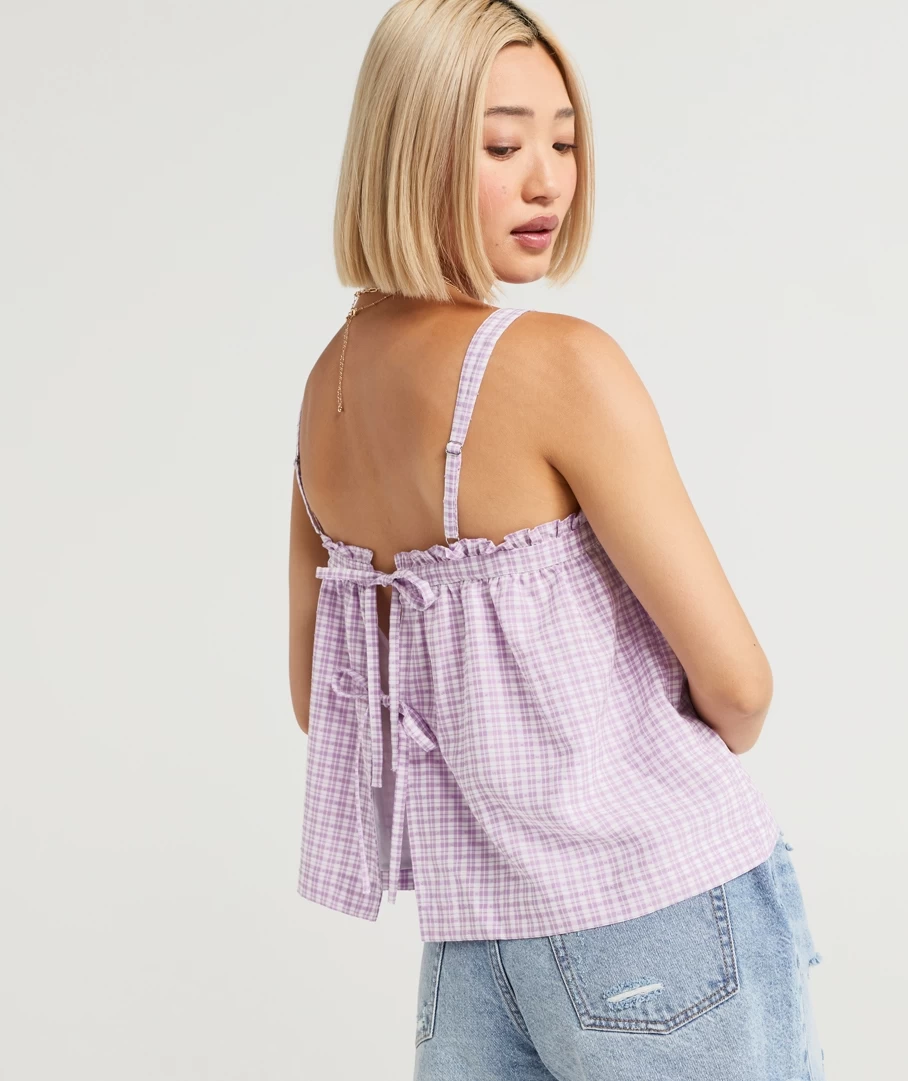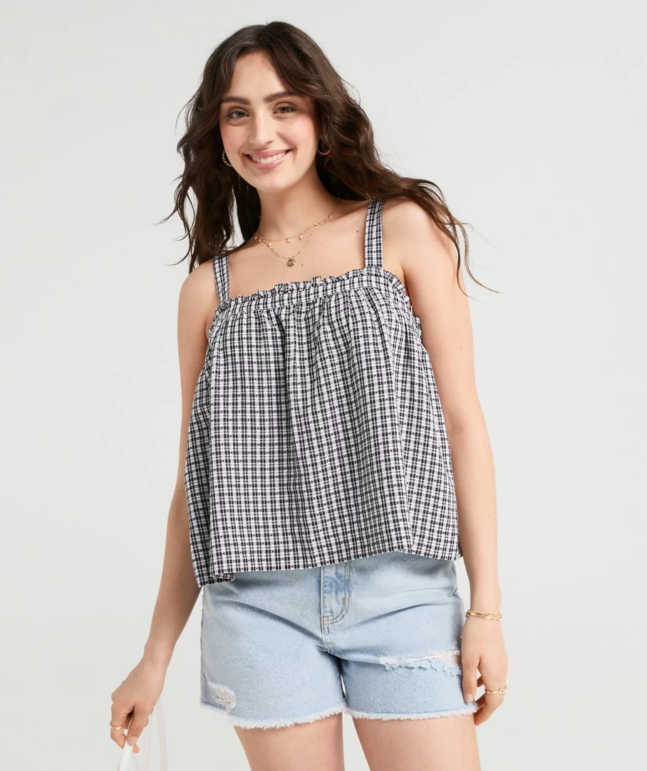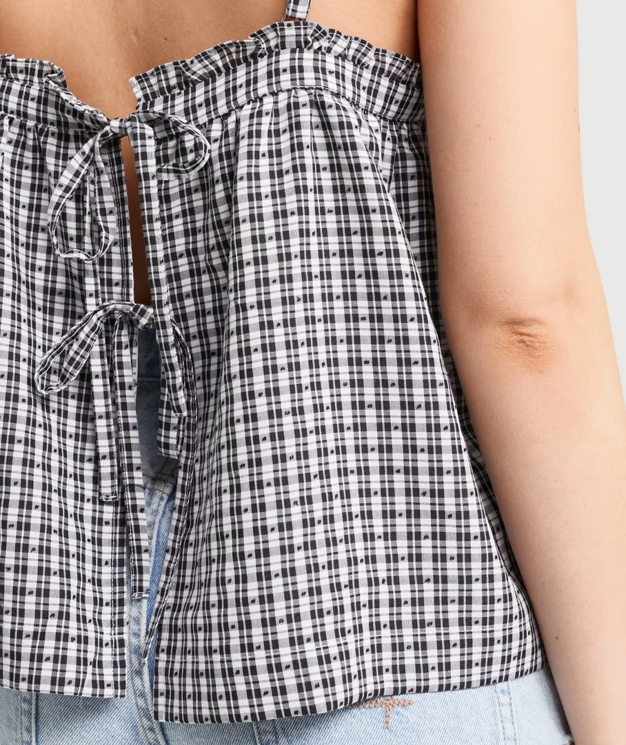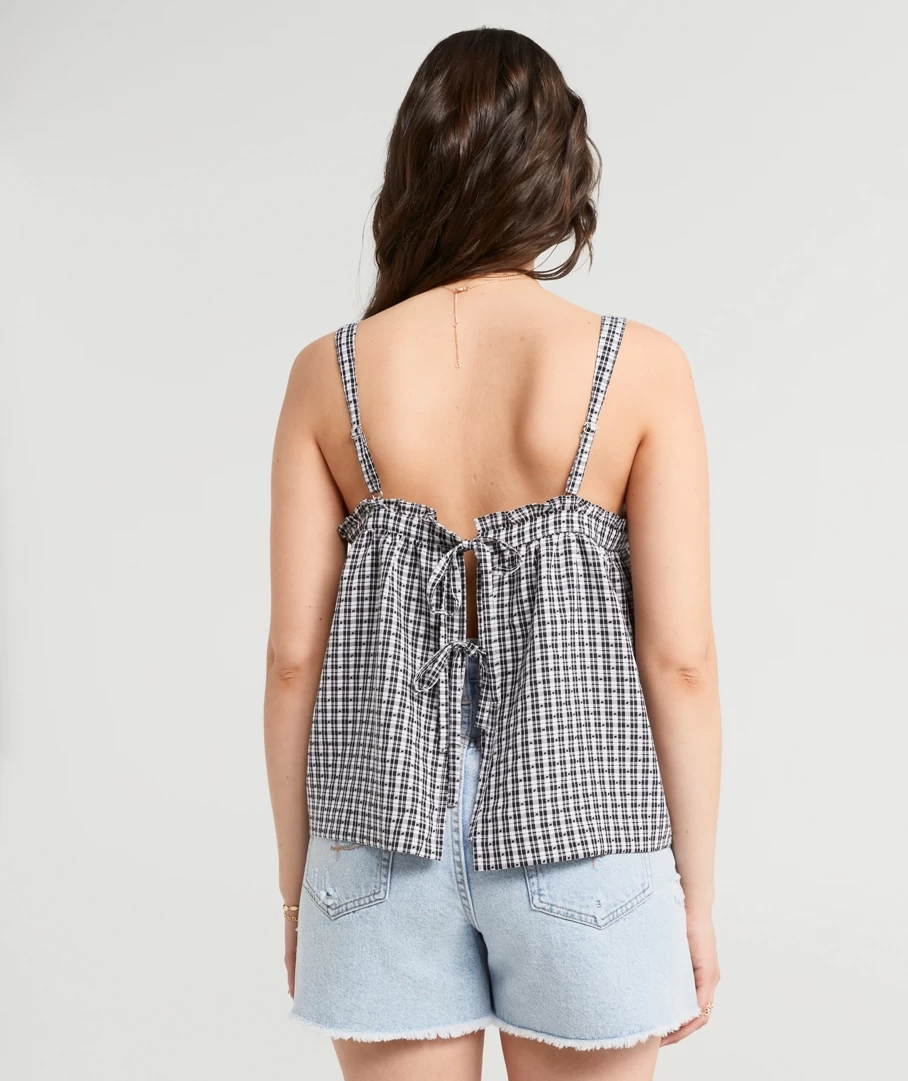 We love a cute gingham moment and the Quinn Gingham Cami is giving us all the feels at all angles. Made with adjustable thin straps, loose fit, square necklace, ruffle stitching detail and back tie up closure.