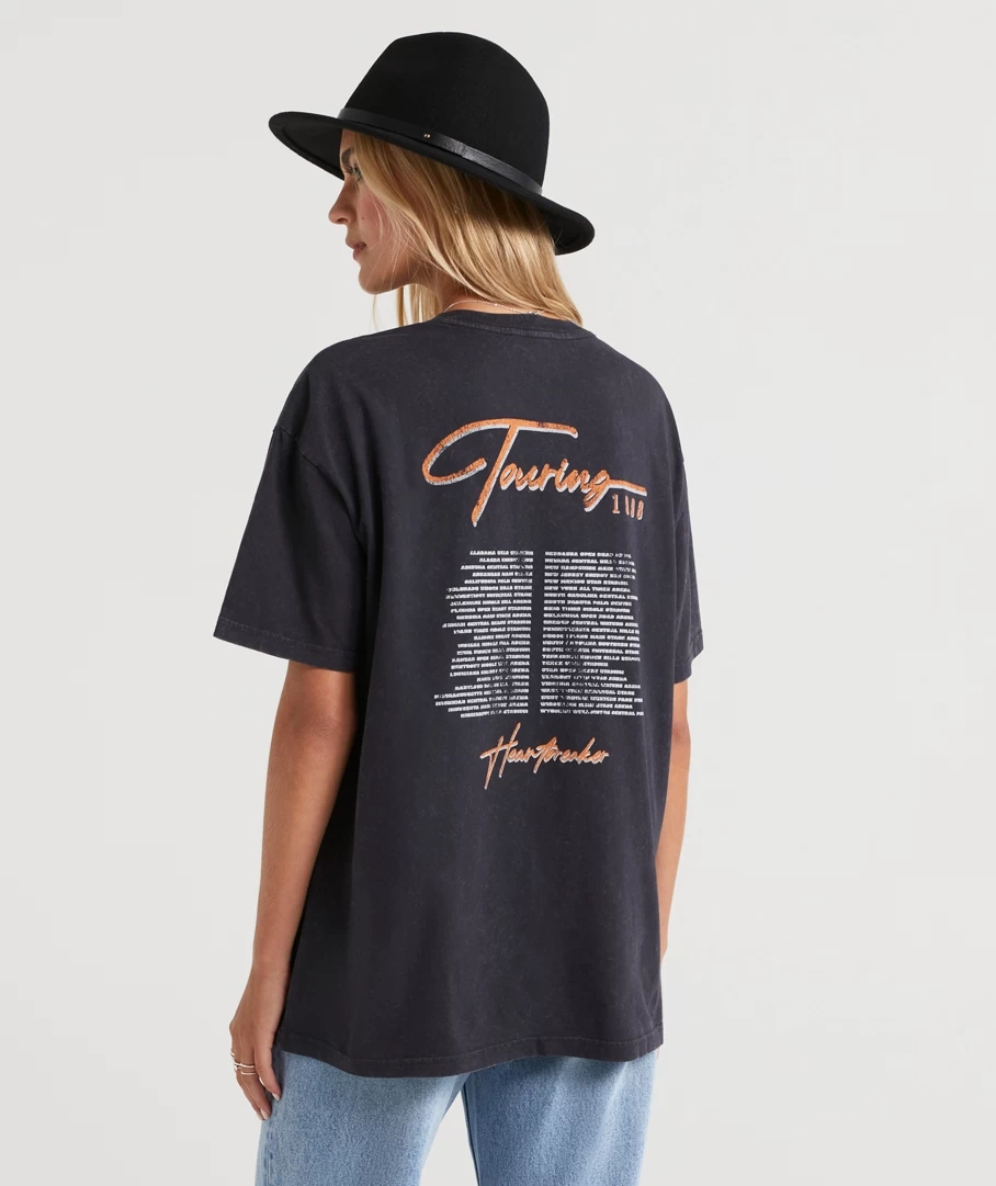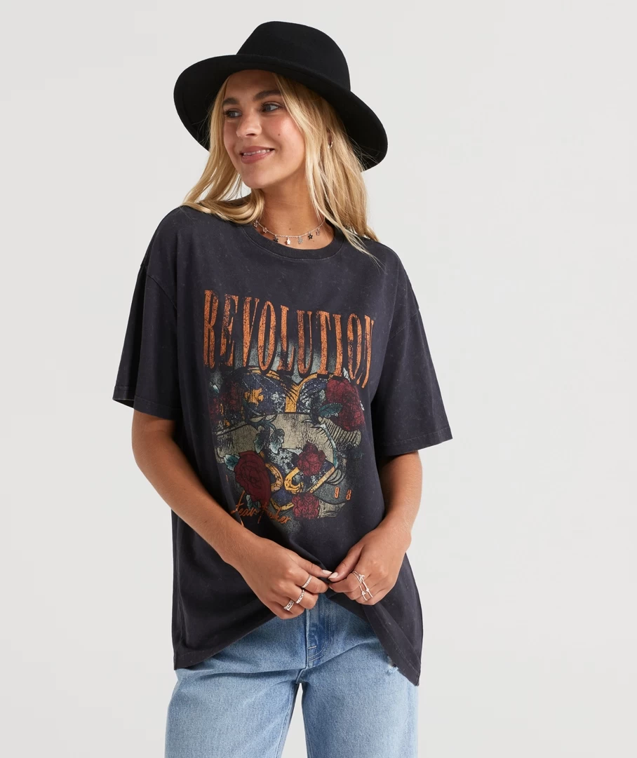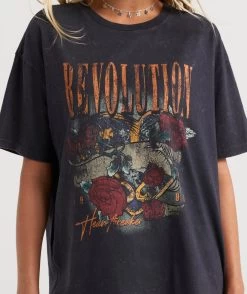 The Revolution Graphic Boyfriend T-shirt is an easy go-to top. Made with 100% cotton, oversized fit, full length, short sleeves, washed black colour with a graphic in the center. Pair with some denim bottoms for a casual look.
