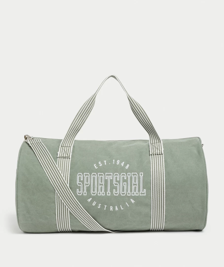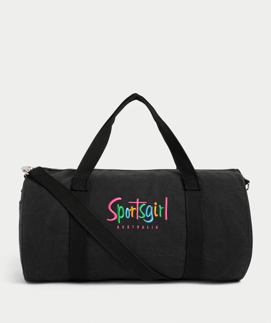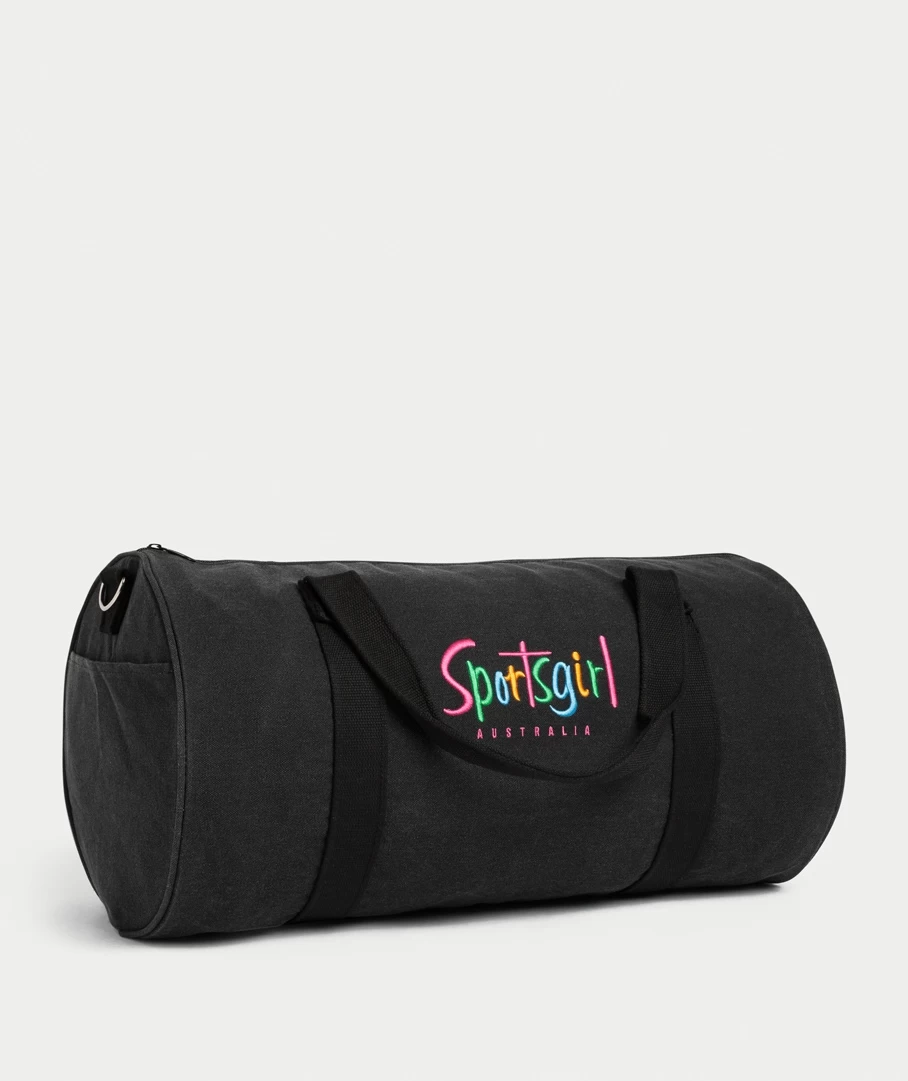 Pack in style with the iconic Sportsgirl Duffle Bag. Designed with a cotton blend, tunnel shape, two shoulder straps, a removable & adjustable crossbody strap, side pockets, zip closure and the Sportsgirl logo printed on the front. Carry all your goods in this spacious and durable duffle bag.