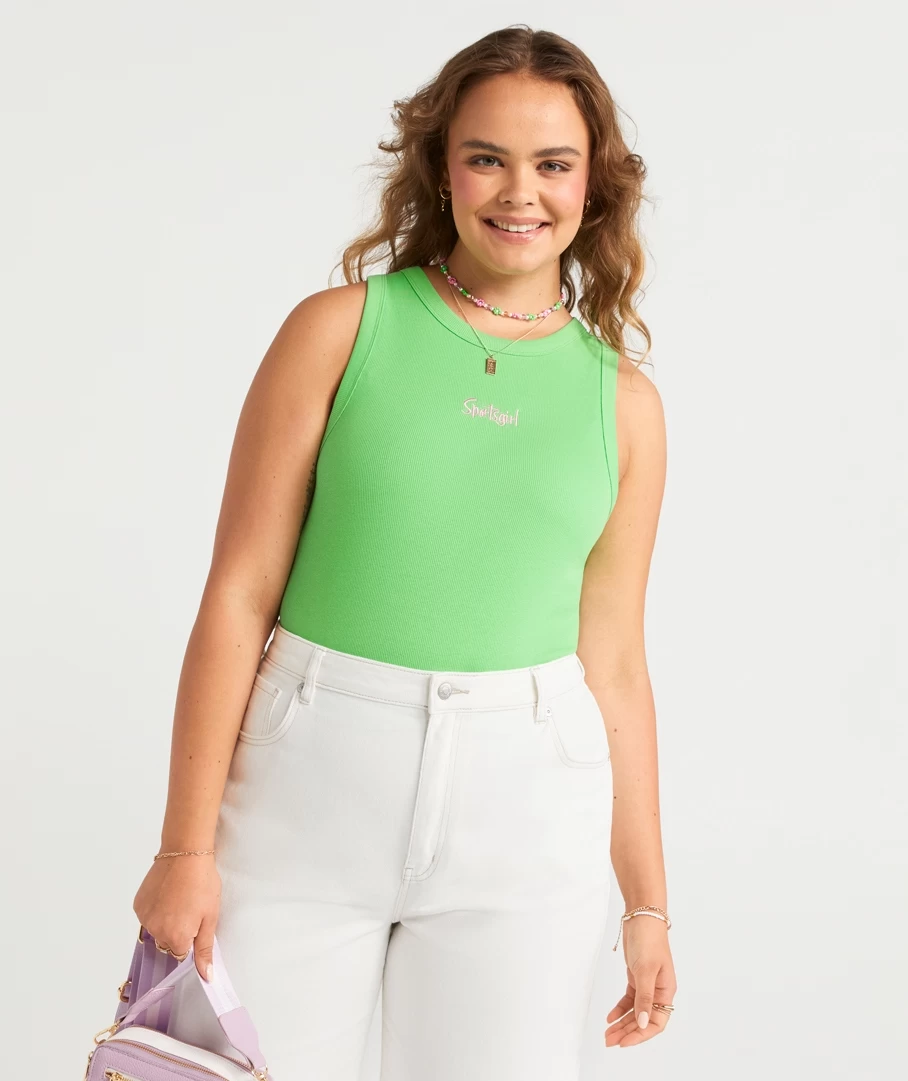 Add to the essentials with the Rewind Logo Rib Tank. Made with a cotton blend, fitted throughout, sleeveless and the Sportsgirl logo embroidered on the front. Pair with your fave bottoms for a casual day look. Add a pretty bag to complete your look.